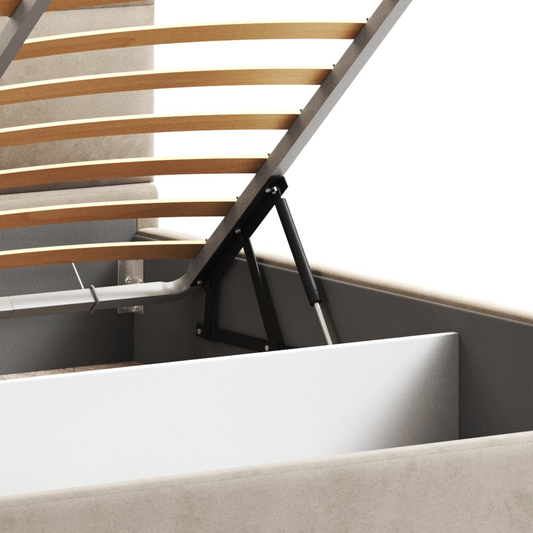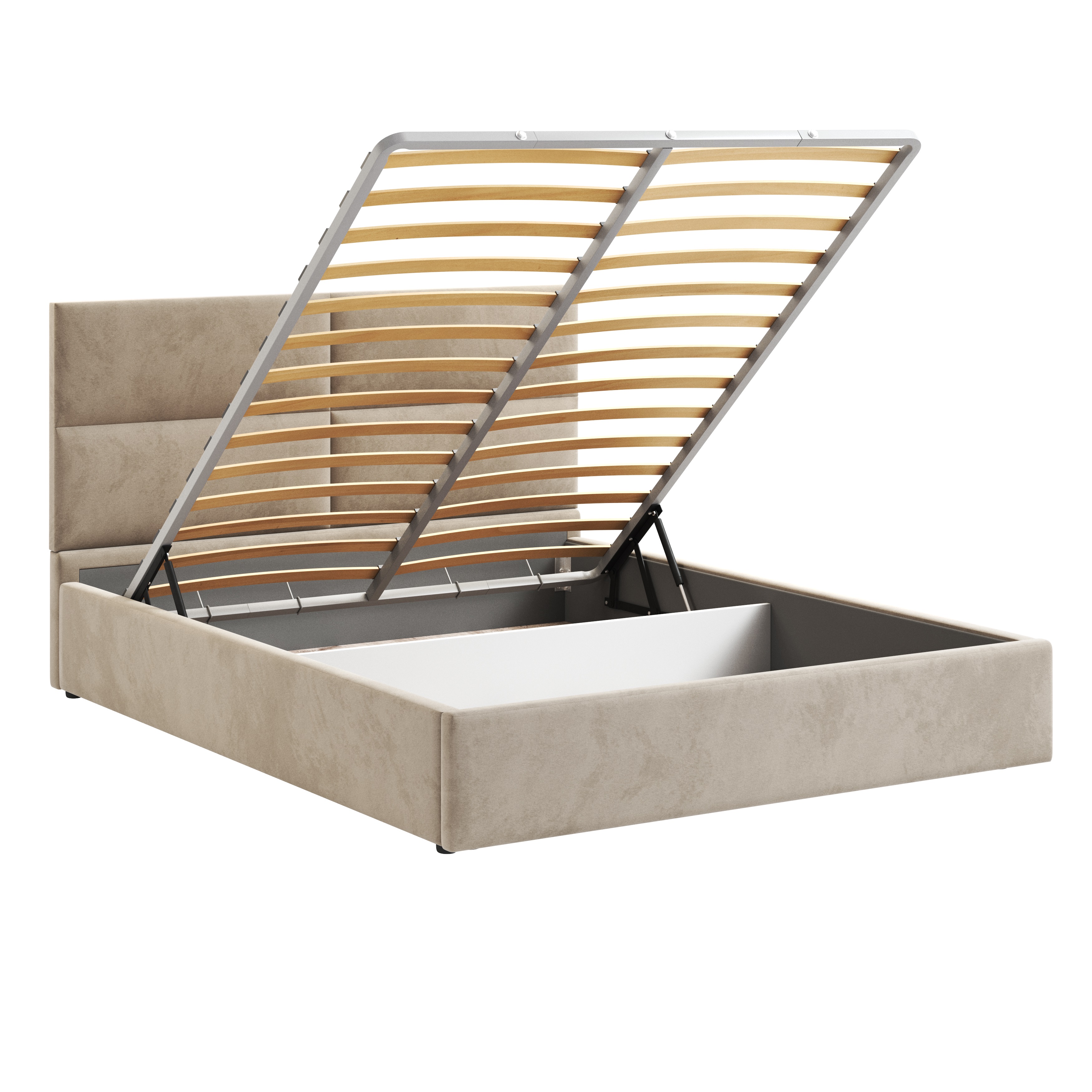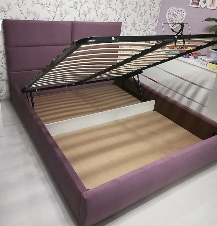 Кровать оснащена подъемным механизмом на газ/лифтах и вместительным ящиком для белья, что позволяет экономить пространство в спальне и обеспечивает дополнительное место для хранения постельного белья и других вещей.
