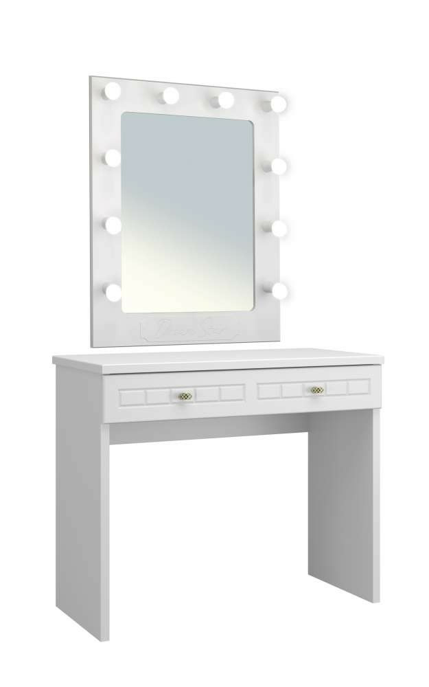 Материал корпуса/фасада: ЛДСП/МДФ. Цвет корпуса/фасада: белое дерево. Размеры столика (ш/г/в) в мм: 900х450х750. Размеры зеркала (ш/г/в) в мм: 675х60х800. Лампочки в комплект не входят и приобретаются отдельно. Тип направляющих ящика: телескопические.