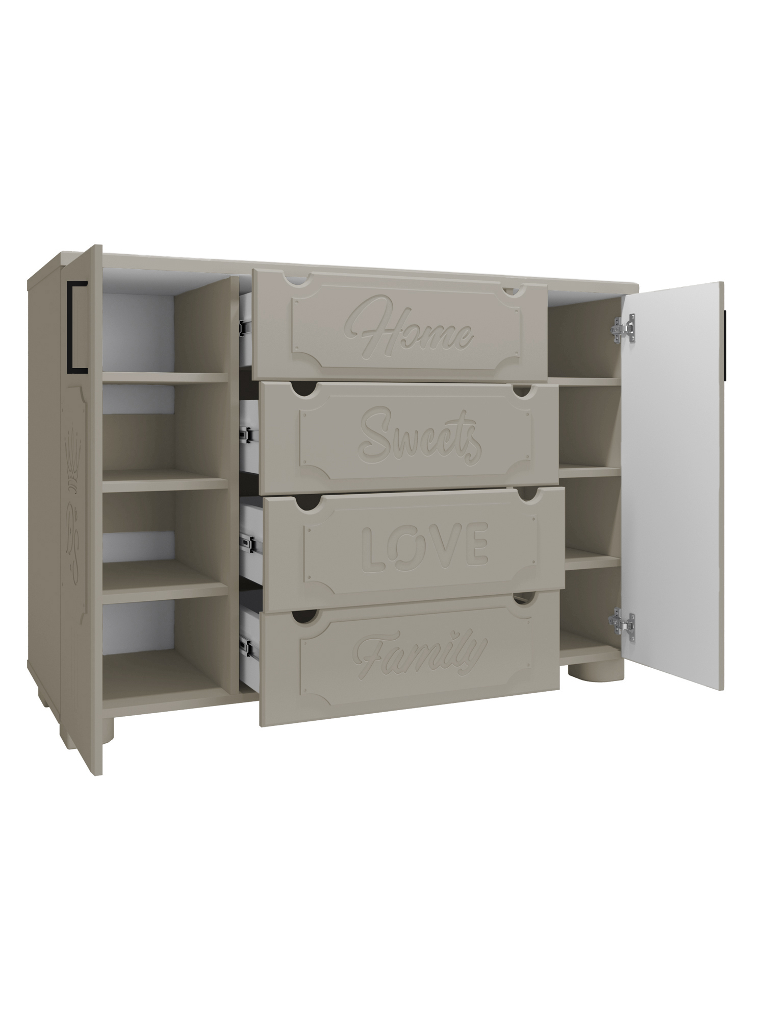 Система мебели Дримстар включает в себя отдельные самостоятельные модули, сочетающие в себе функциональность и уникальность дизайна. С базовым набором модулей легко оформить интерьер любого помещения. Все модули можно комбинировать между собой. Фасады украшены надписями, которые придают моделям оригинальный вид. Коллекция Дримстар поможет вам в оформлении стильного и современного интерьера.