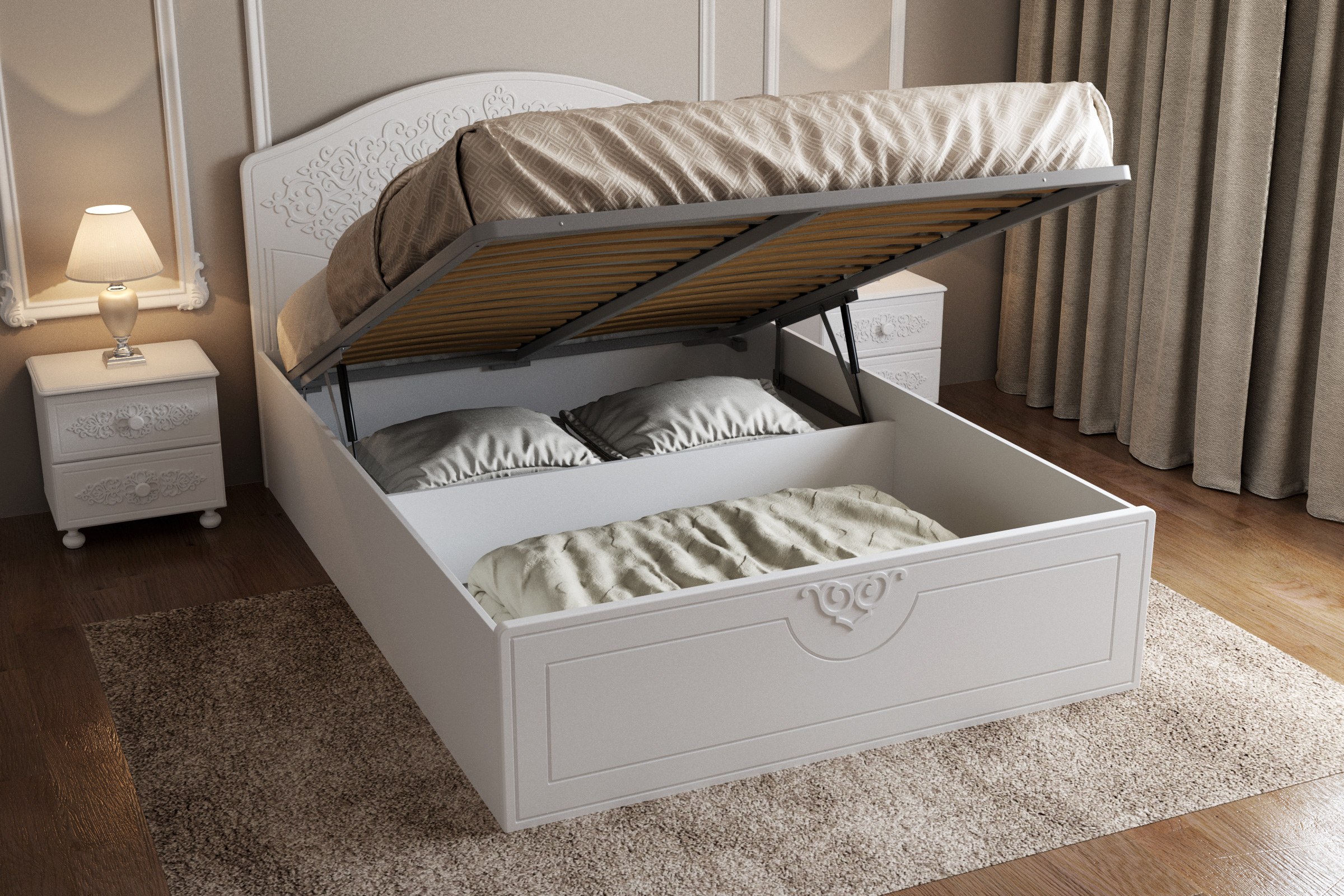 Кровать с подъемным механизмом Ассоль АС-60 имеет высокое и шикарное изголовье. Каждый завиток узора будет восхищать вас, ведь такой мебели нет ни у кого. Коллекция Ассоль эксклюзивна по своему дизайну. Кровать оснащена подъемным механизмом, обеспечивающим доступ в короб для хранения постельного белья. Короб разделен на три одинаковых сегмента с ножками, изготовлен из ЛДСП. Ламель кладется на специальные мебельные полки и угловые стяжки. Мебель изготовлена из качественной ламинированной ДСП 16 и 25 мм. В оформлении фасадов МДФ применяется уникальная технология нанесения объемного узора (3-D). Обратите внимание! Матрас в комплект не входит и приобретается дополнительно.