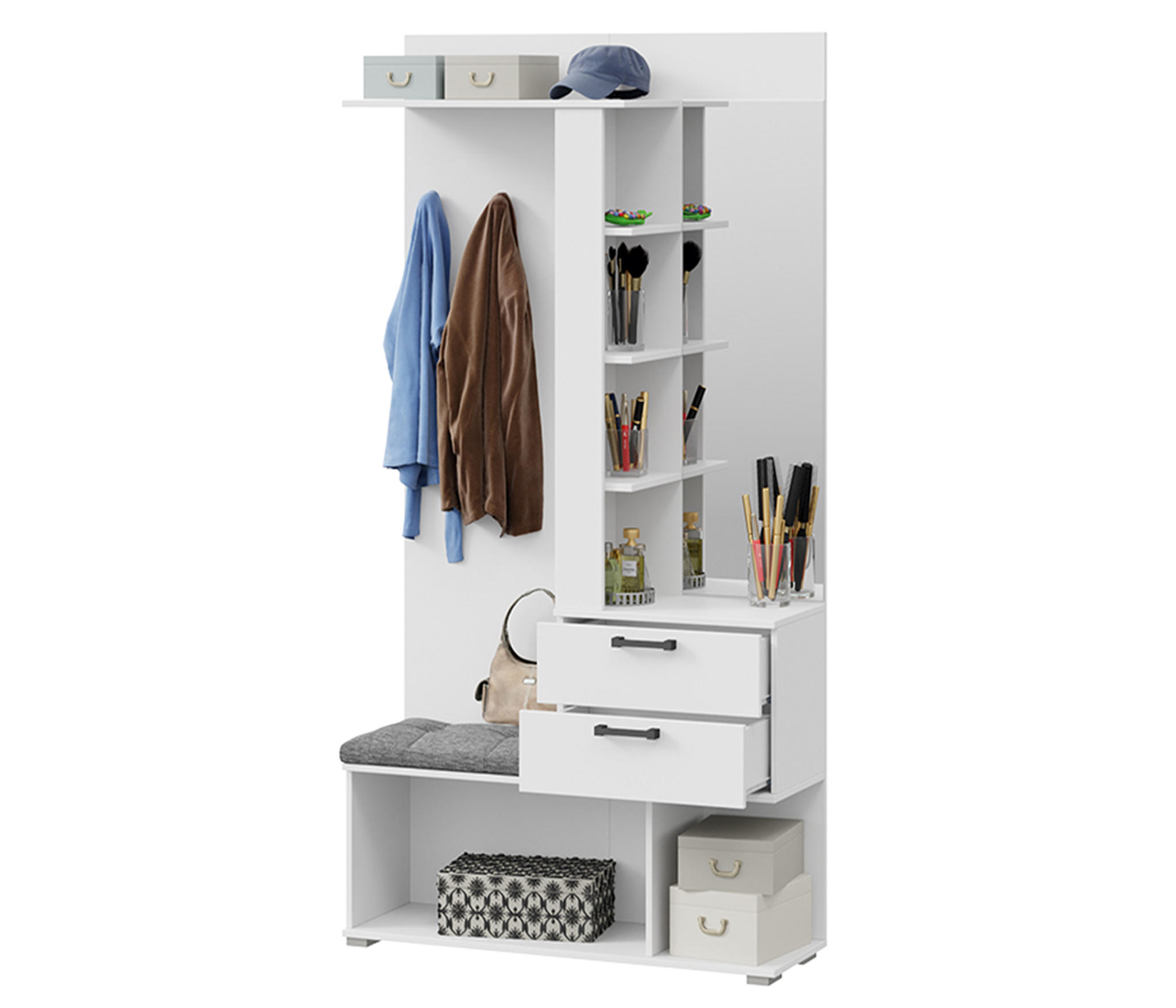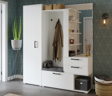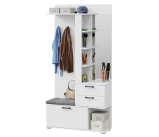 В комплекте: шкаф для одежды, обувница с мягким сиденьем, открытая секция для верхней одежды, выдвижные ящики и антресольные полки для головных уборов, открытые полки.