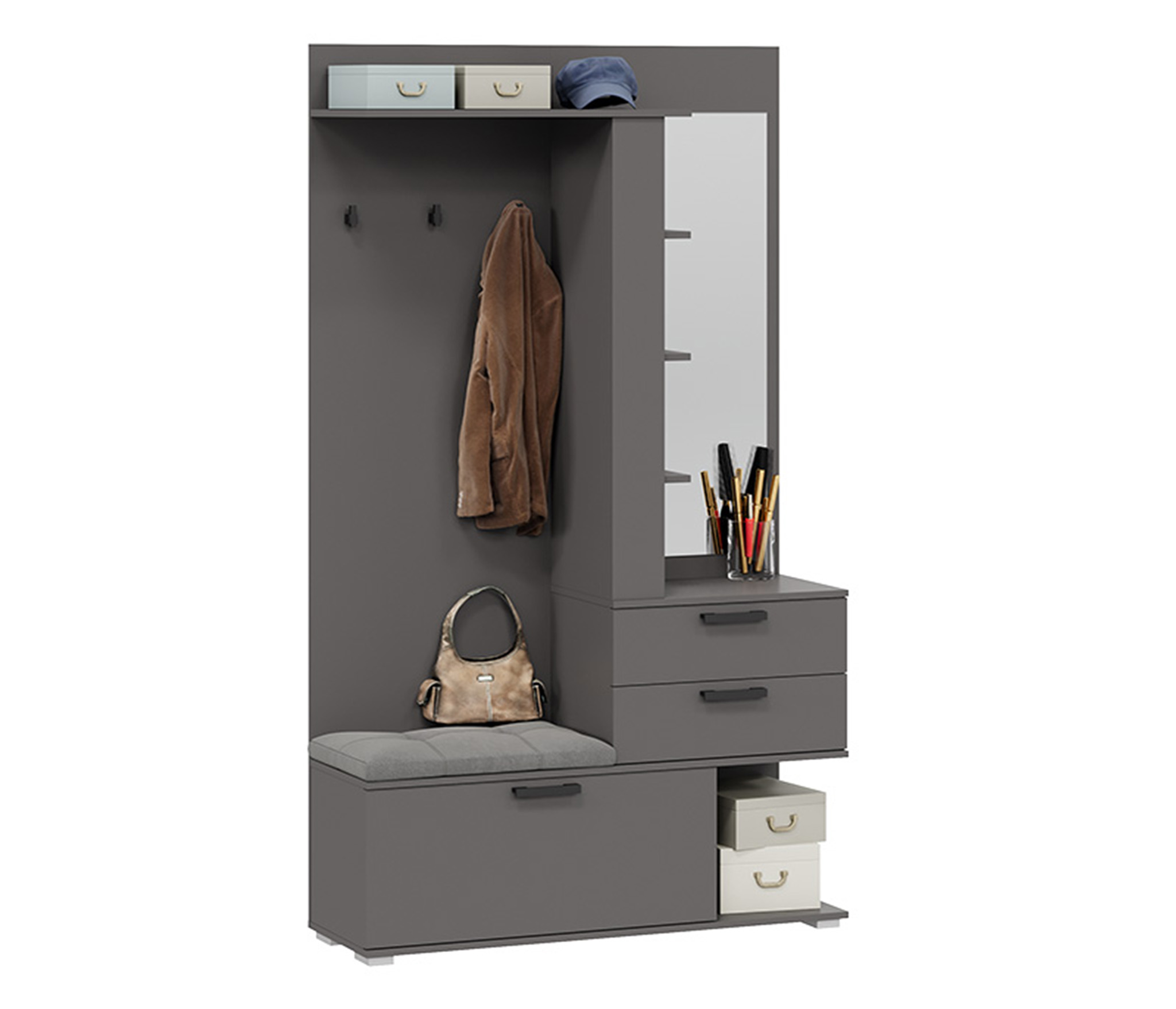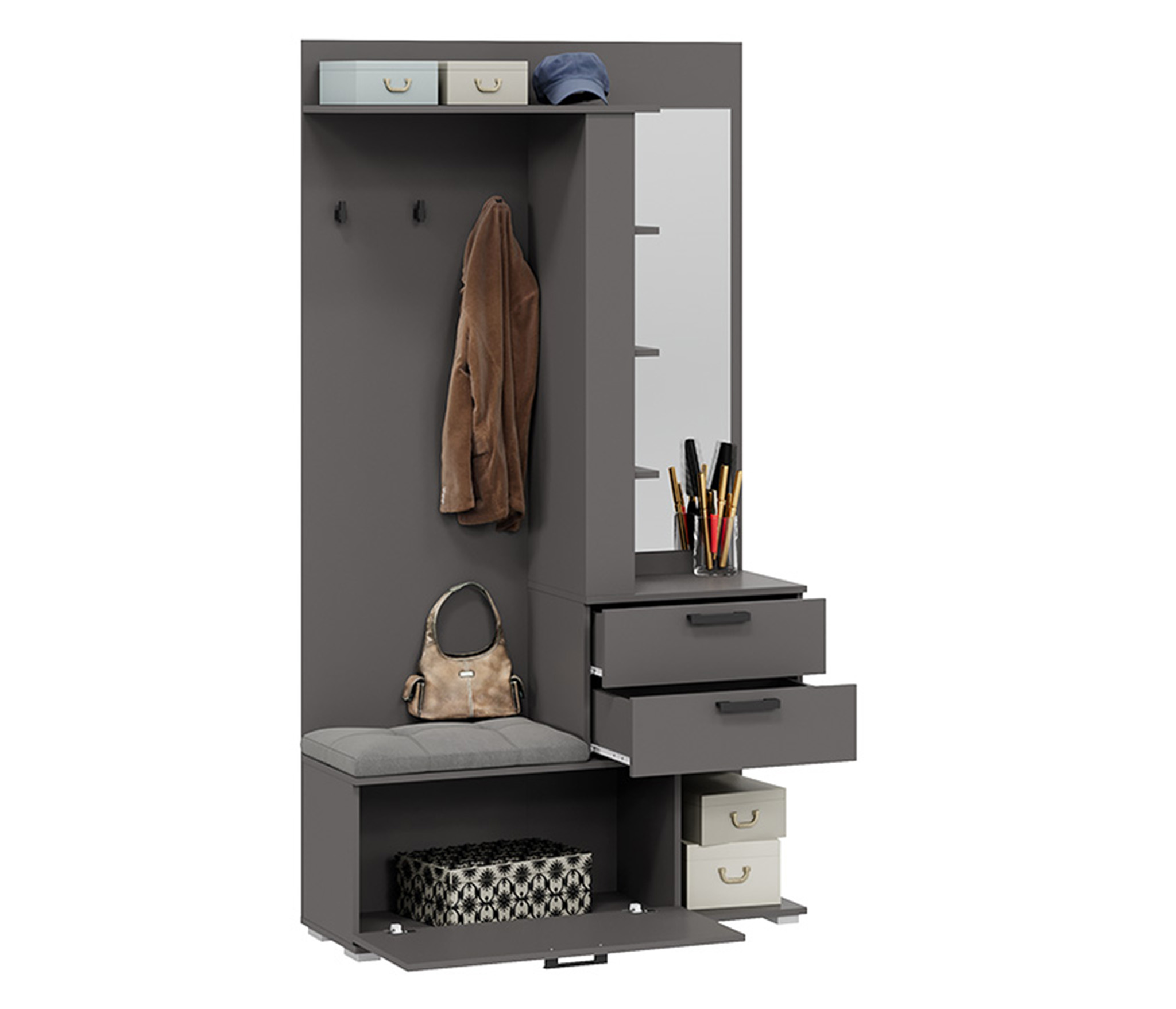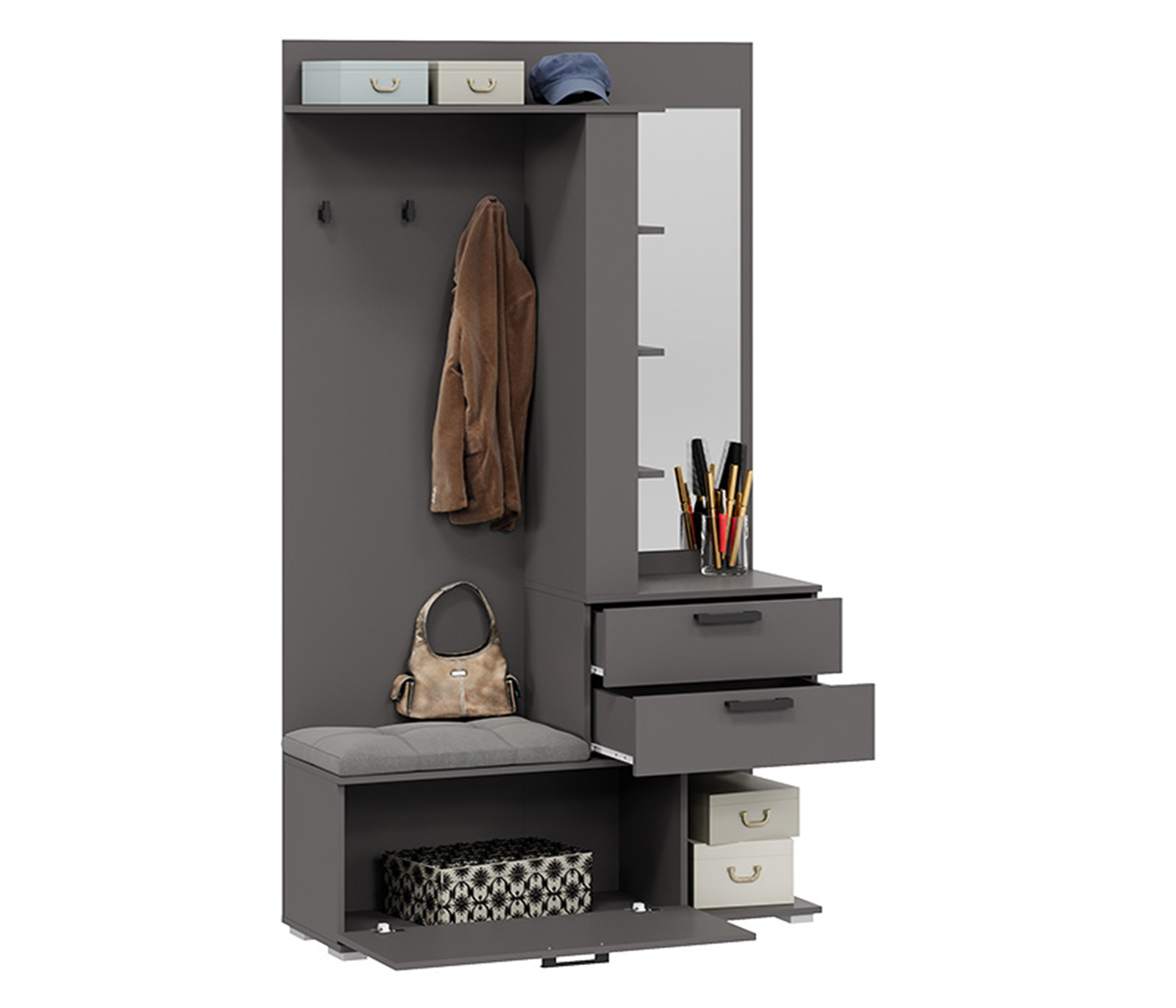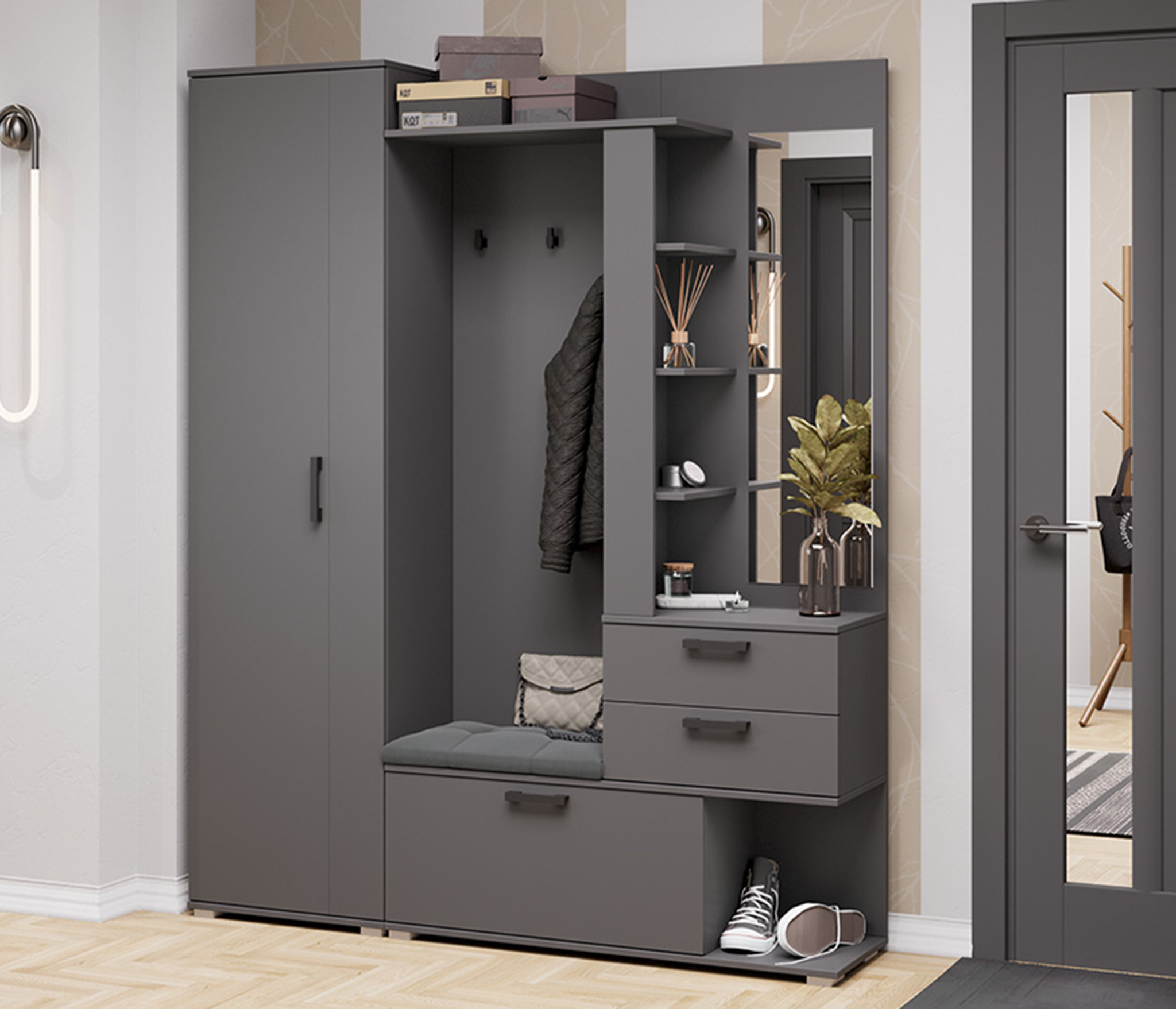 В комплекте: шкаф для одежды, обувница с мягким сиденьем, открытая секция для верхней одежды, выдвижные ящики и антресольные полки для головных уборов, открытые полки.