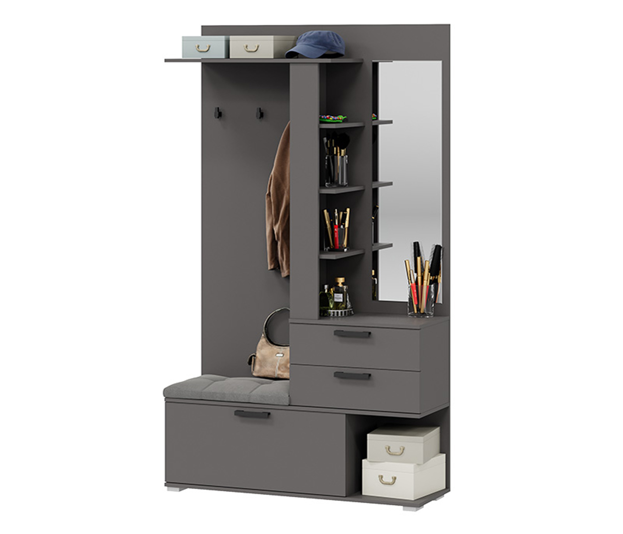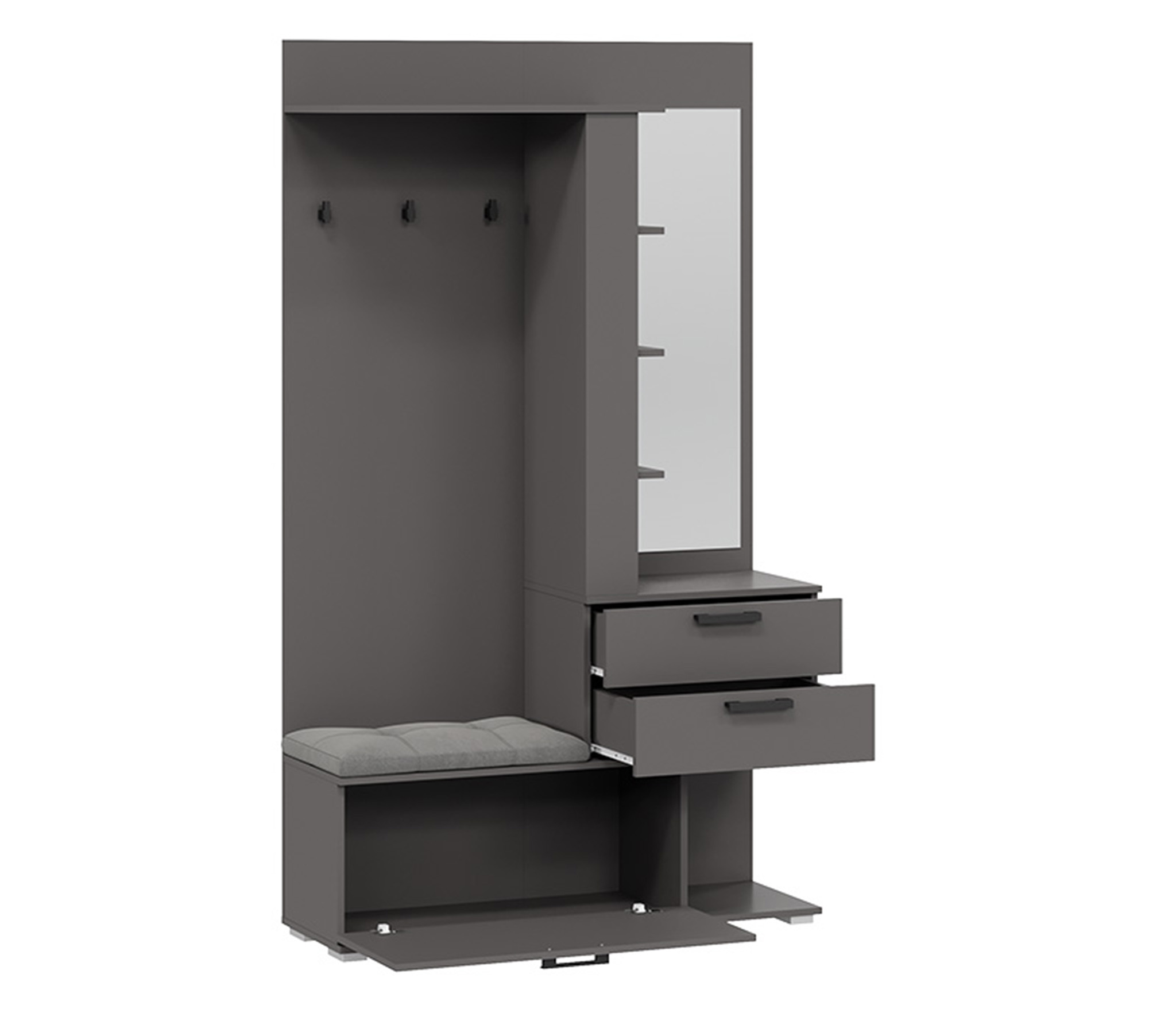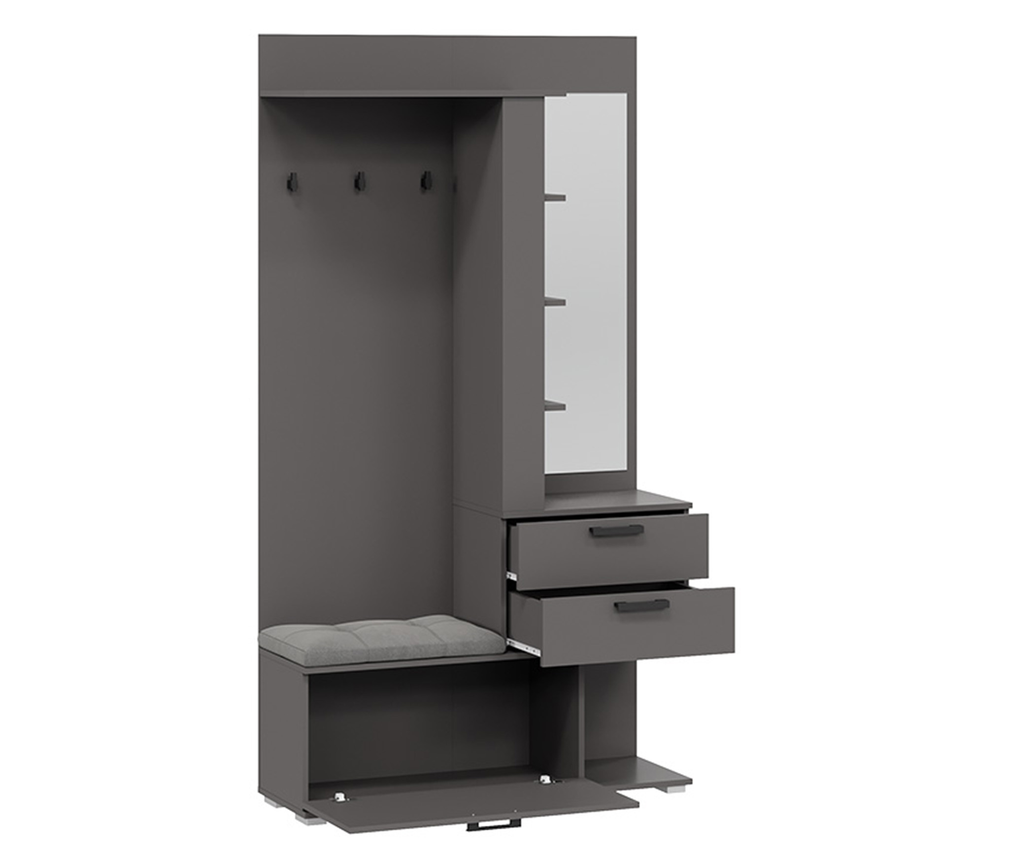 В комплекте: шкаф для одежды, обувница с мягким сиденьем, открытая секция для верхней одежды, выдвижные ящики и антресольные полки для головных уборов, открытые полки.