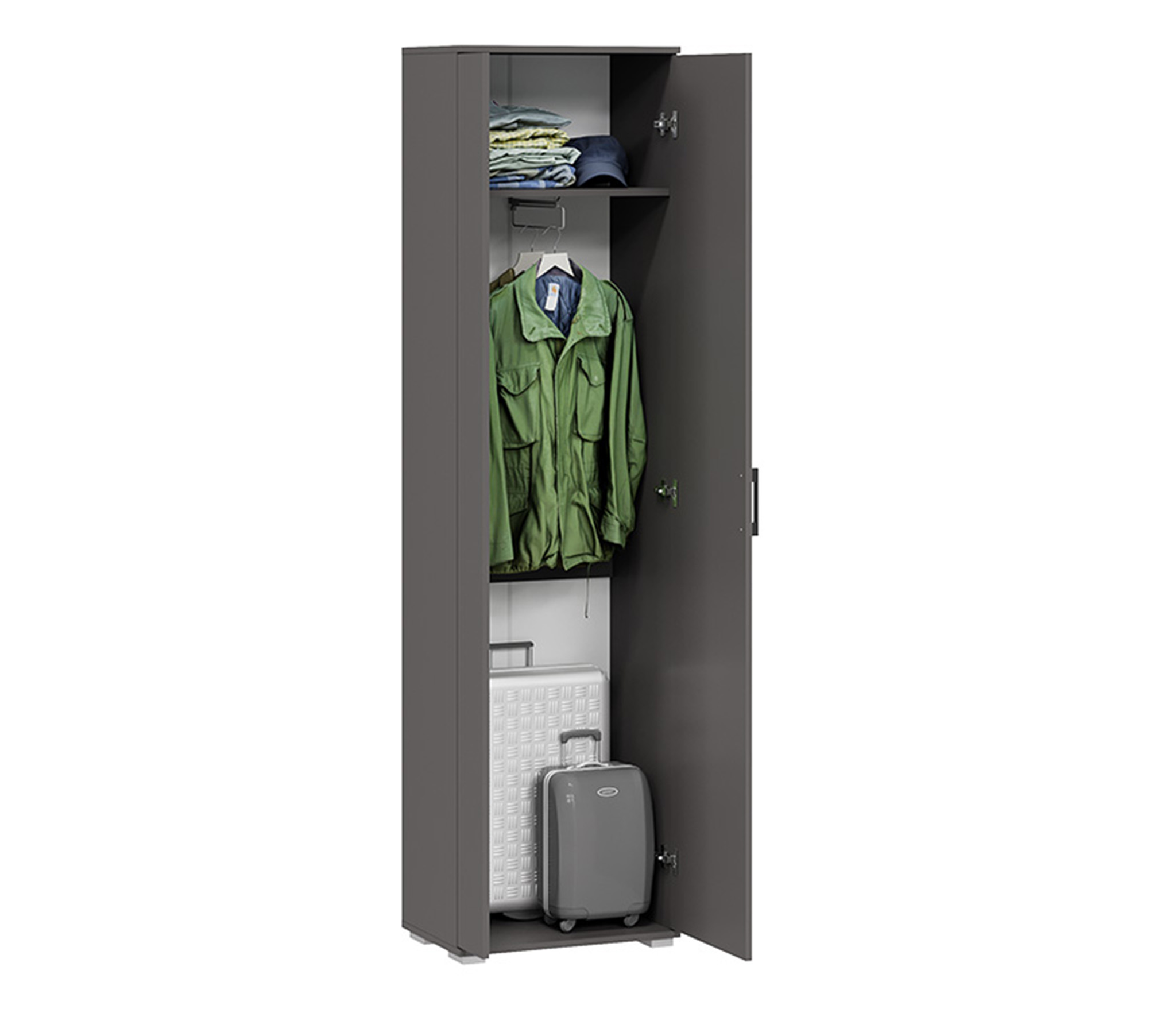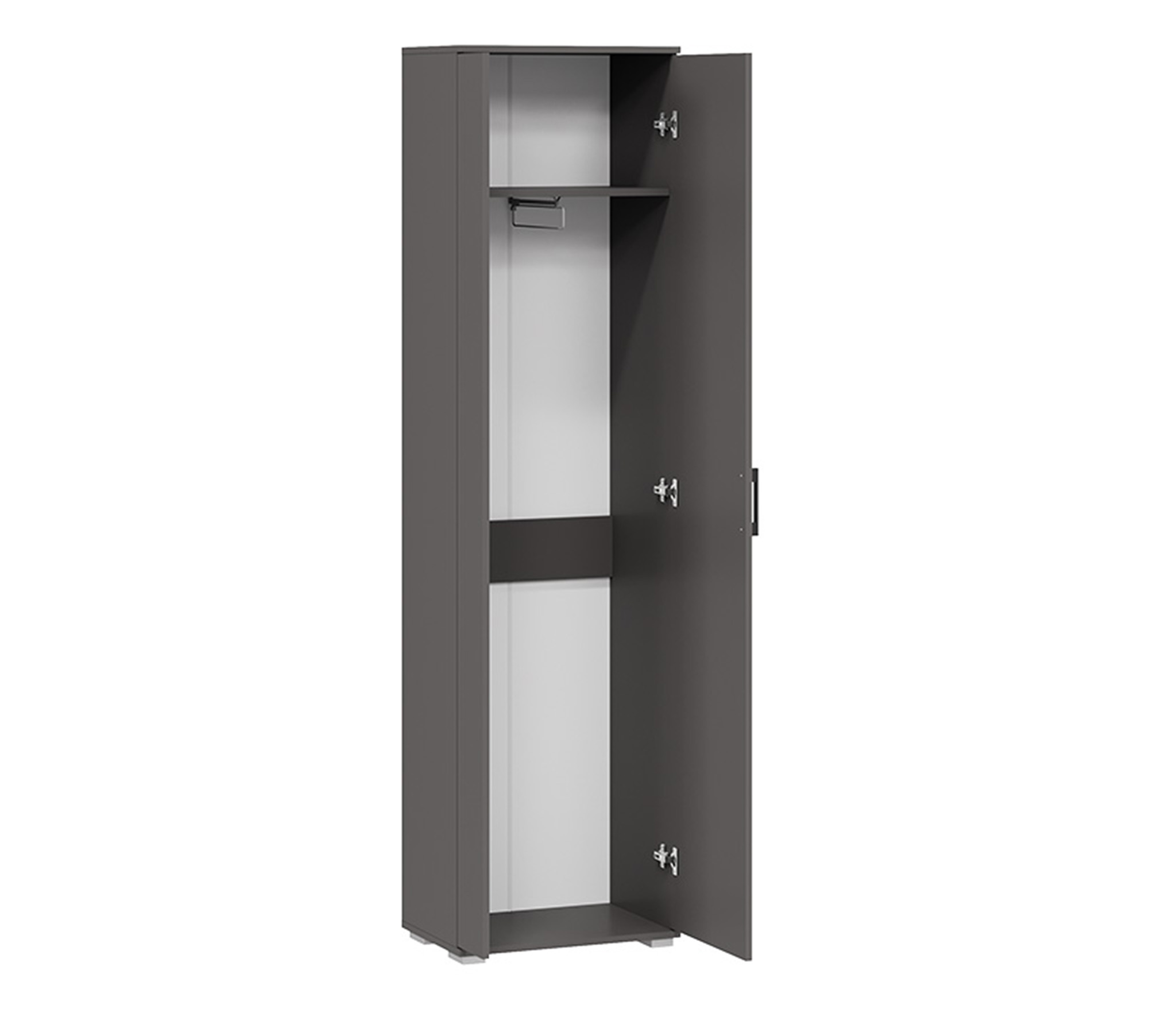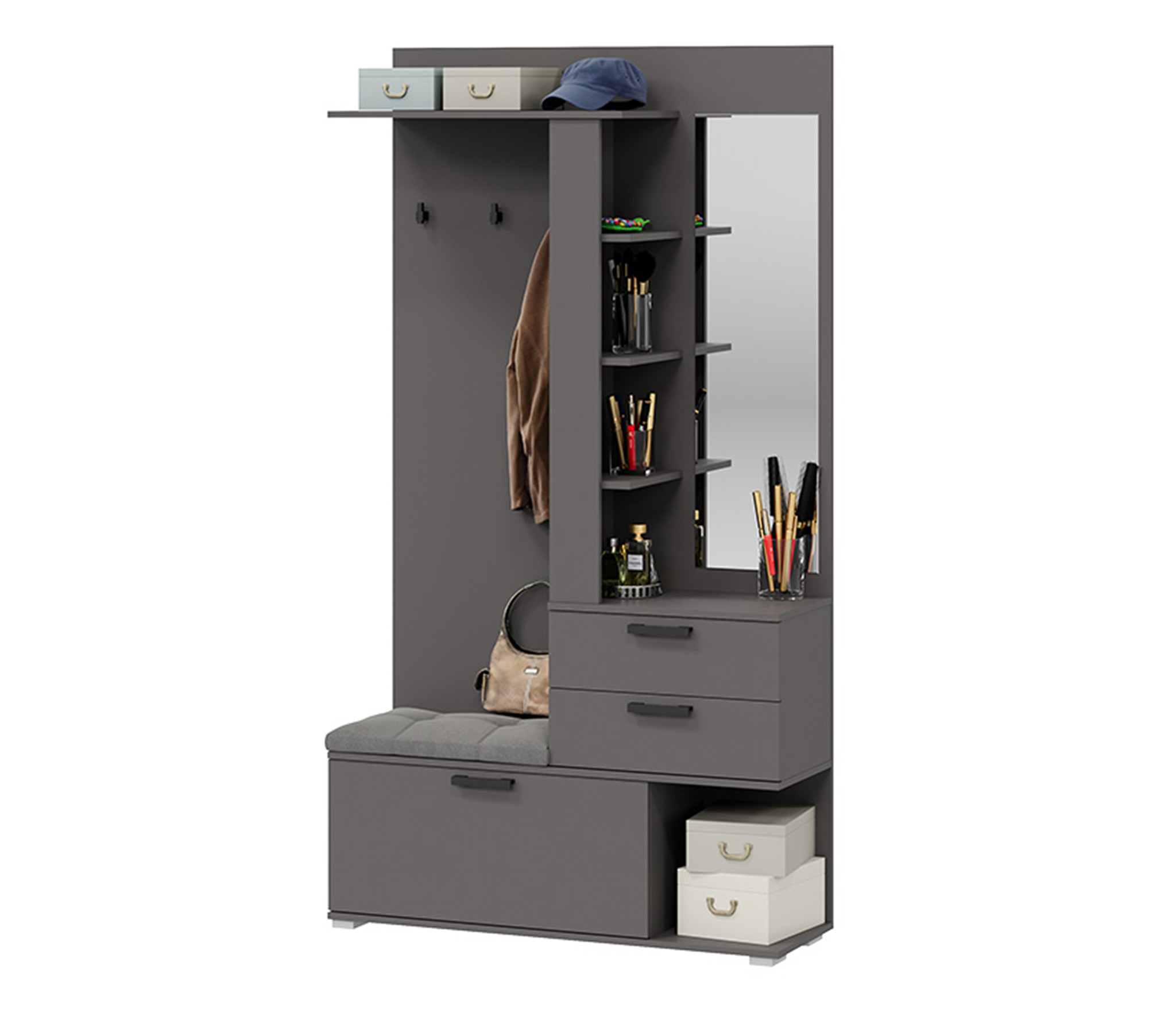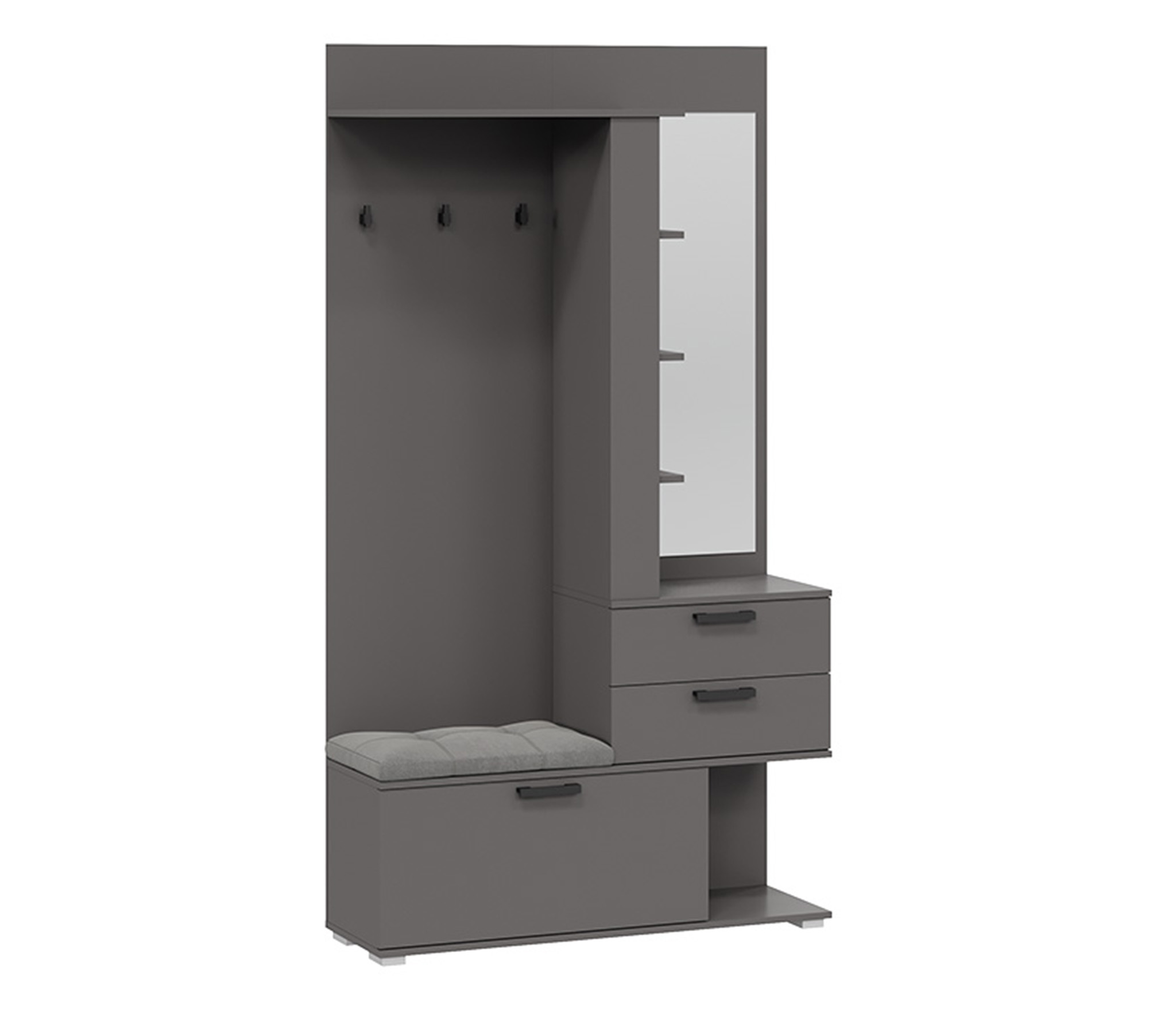 В комплекте: шкаф для одежды, обувница с мягким сиденьем, открытая секция для верхней одежды, выдвижные ящики и антресольные полки для головных уборов, открытые полки.