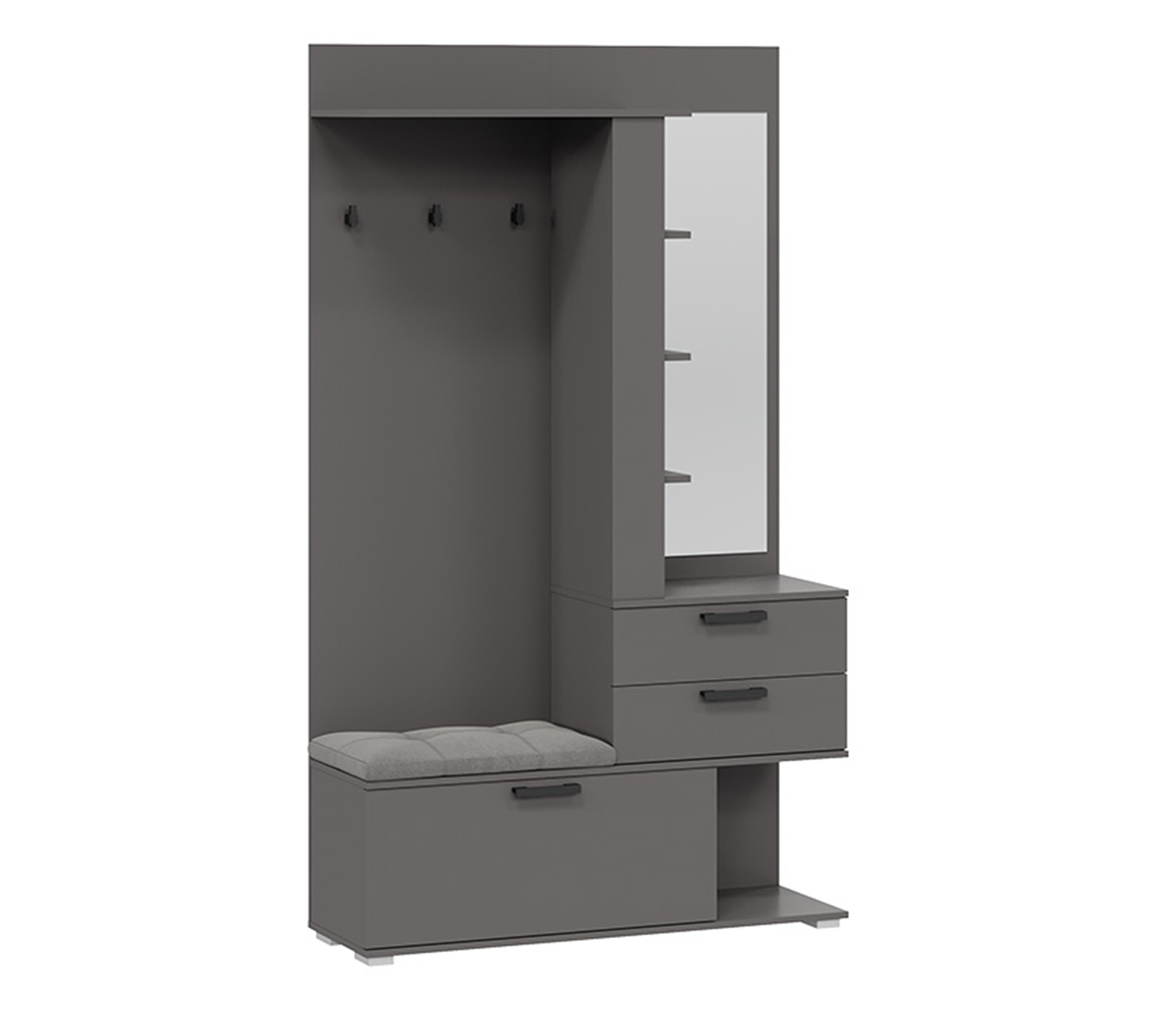 Обувница с мягким сиденьем, открытая секция для верхней одежды, выдвижные ящики и антресольные полки для головных уборов, открытые полки.