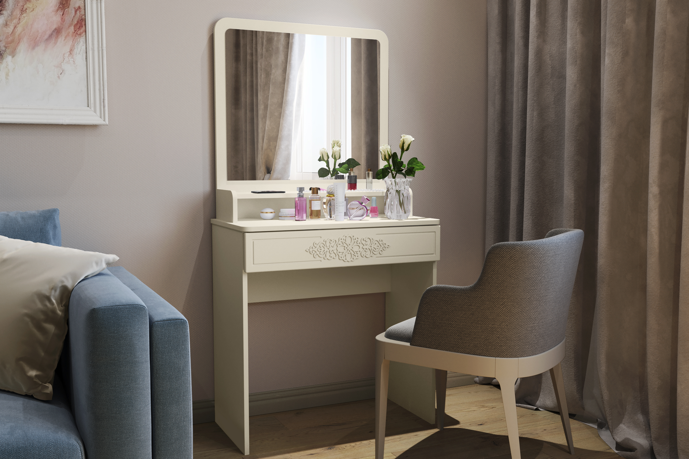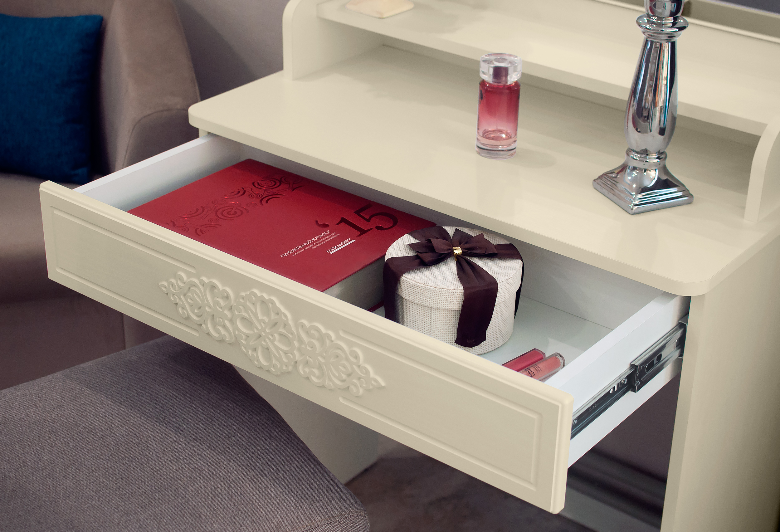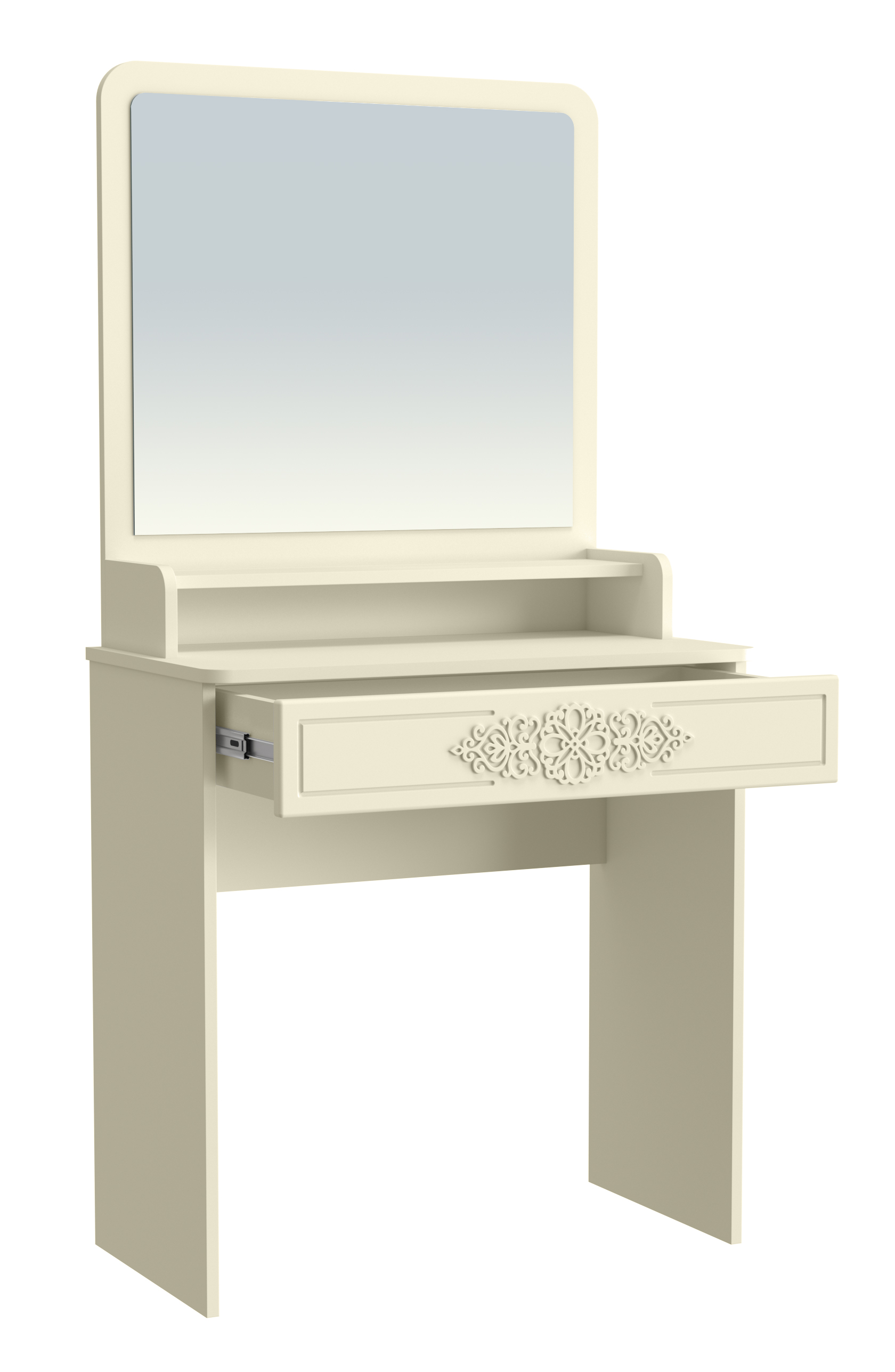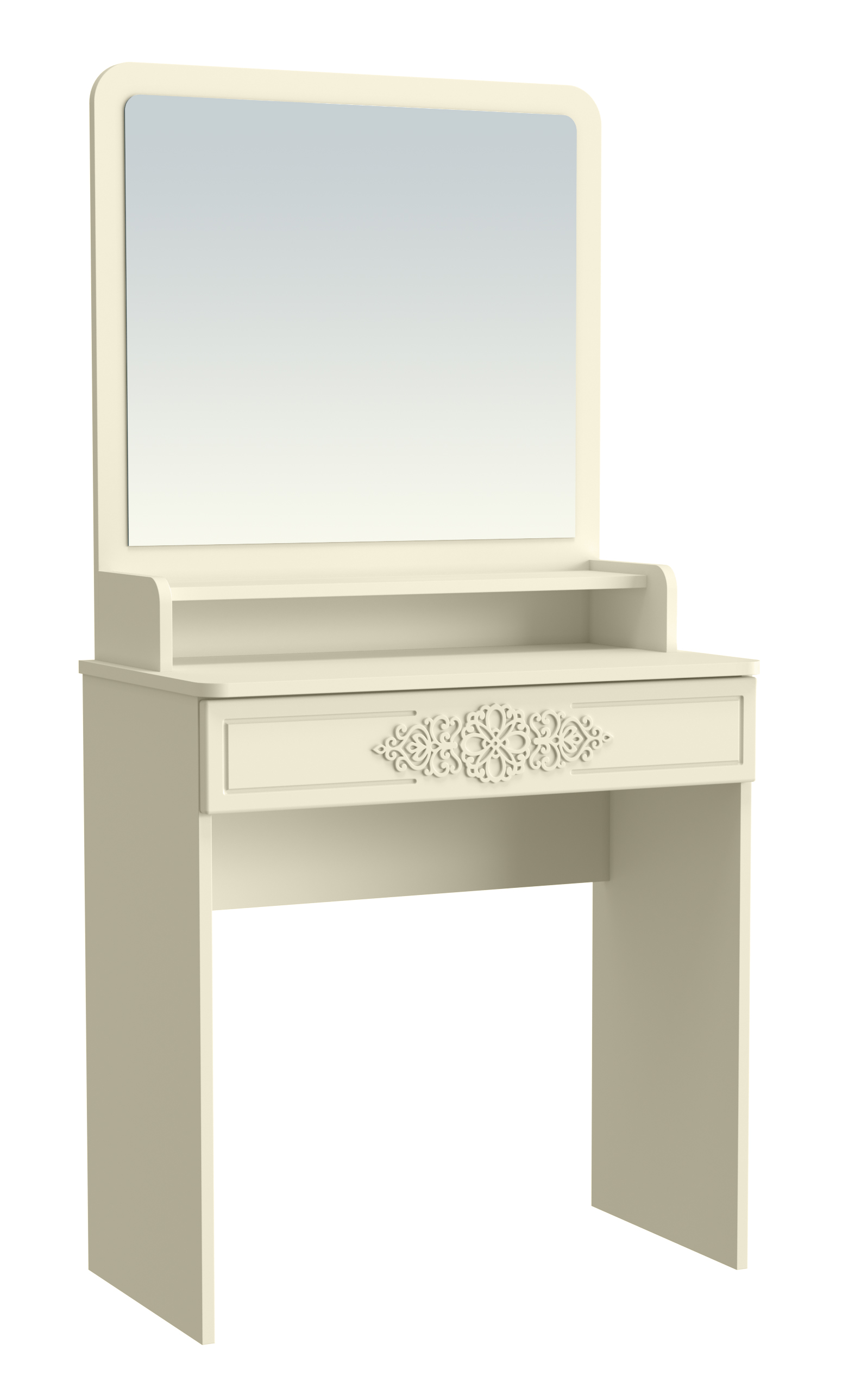 Туалетный столик - неотъемлемая часть спальни или женской комнаты. Каждая девочка, девушка или дама хочет иметь собственное пространство, свой уголок красоты, для того чтобы привести себя в порядок, нанести макияж, удобно и компактно расставить свою косметику и парфюмерию, аккуратно сложить украшения и аксессуары. Столик имеет один выдвижной ящик на телескопических направляющих без доводчиков и зеркало с полкой. Мебель изготовлена из качественной ламинированной ДСП 16 мм. В оформлении фасадов МДФ применяется уникальная технология нанесения объемного узора (3-D).