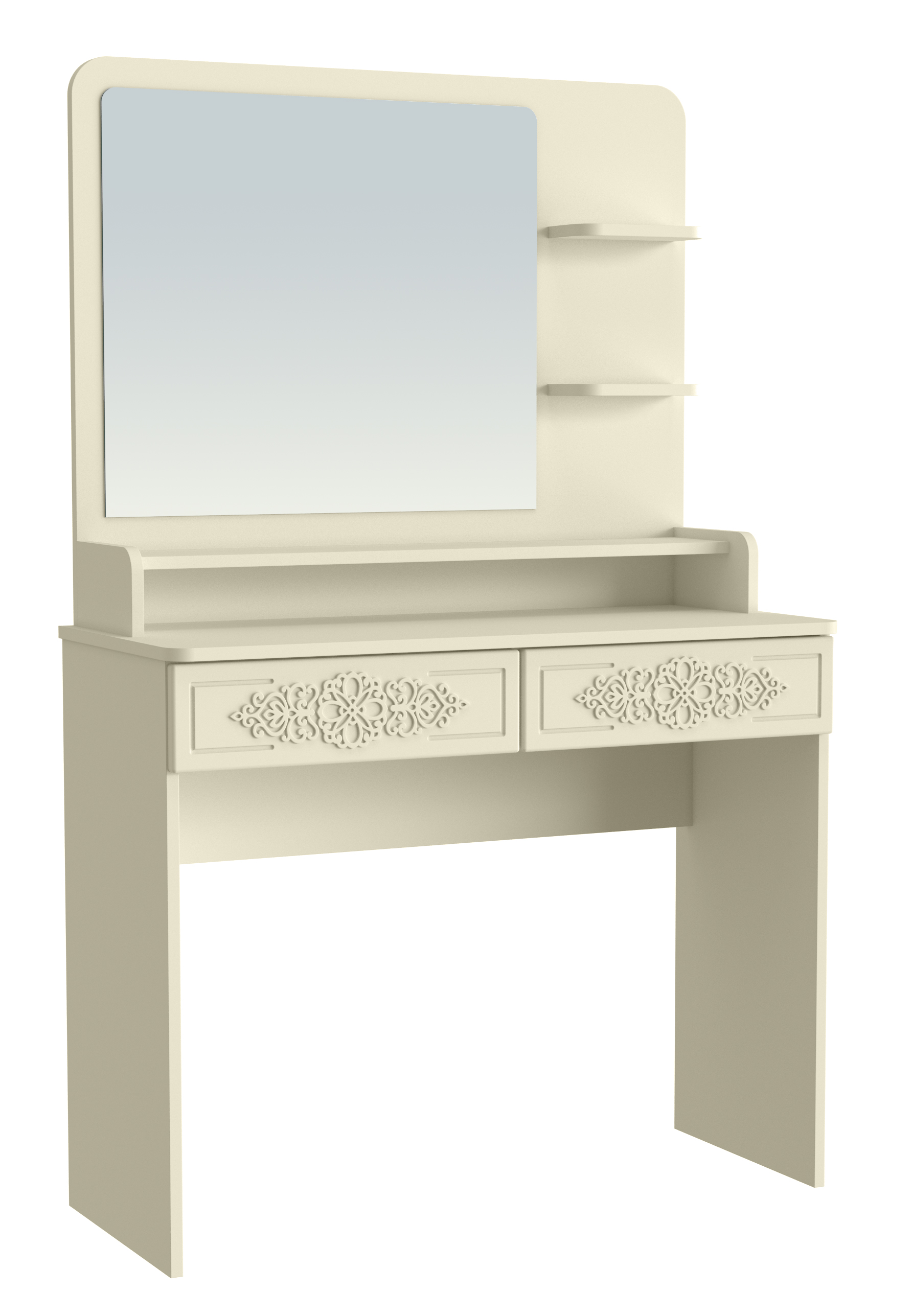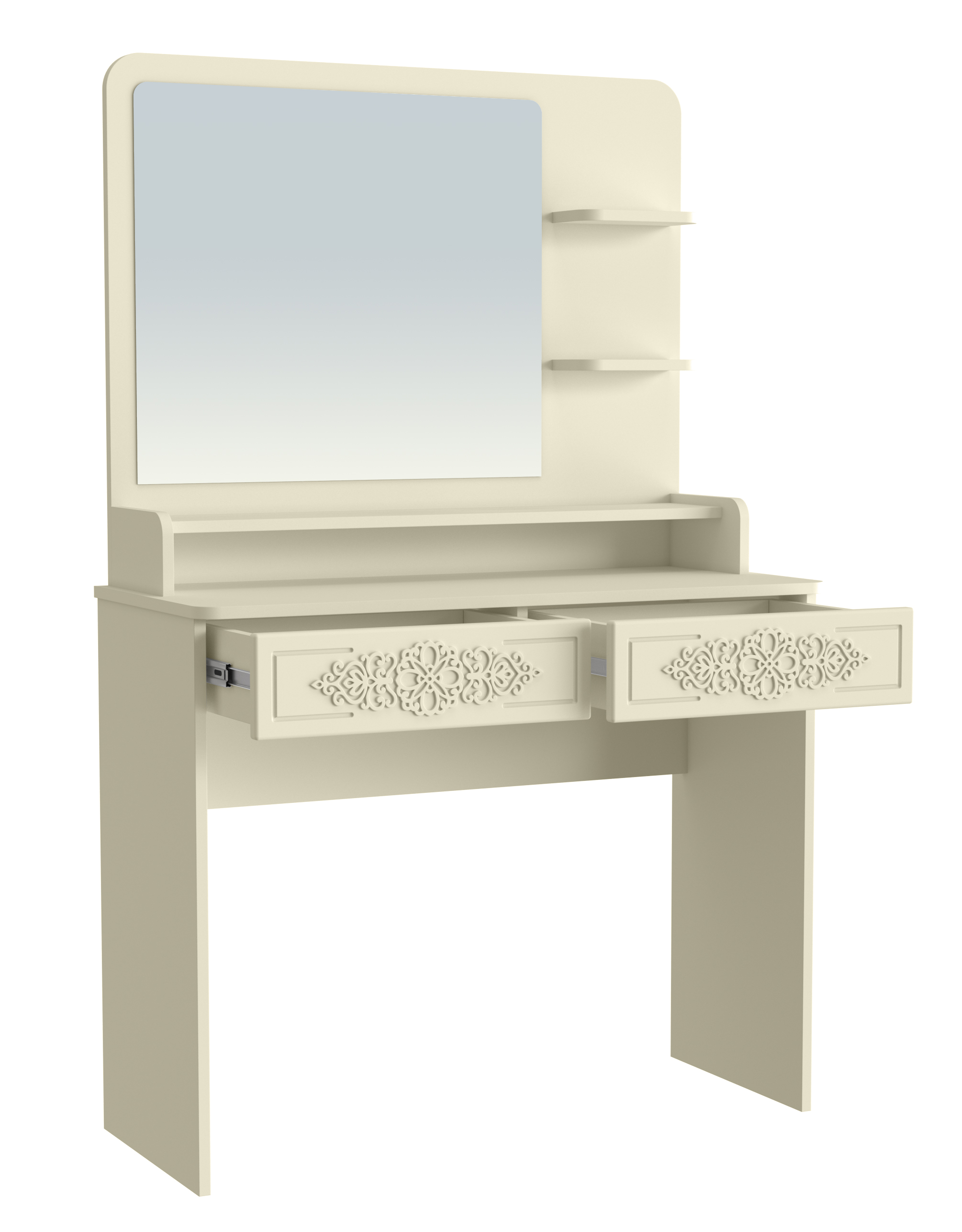 Туалетный столик - неотъемлемая часть спальни или женской комнаты. Каждая девочка, девушка или дама хочет иметь собственное пространство, свой уголок красоты, для того чтобы привести себя в порядок, нанести макияж, удобно и компактно расставить свою косметику и парфюмерию, аккуратно сложить украшения и аксессуары. Столик имеет два выдвижных ящика на телескопических направляющих без доводчиков и зеркало с тремя полками. Мебель изготовлена из качественной ламинированной ДСП 16 мм. В оформлении фасадов МДФ применяется уникальная технология нанесения объемного узора (3-D).