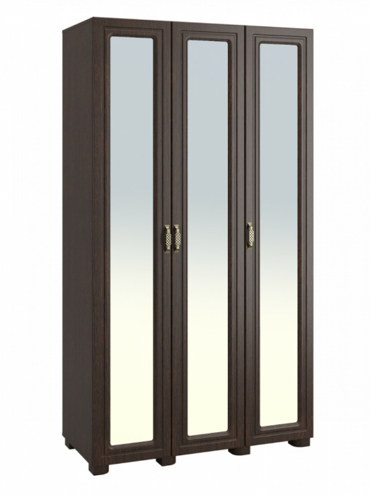 Шкаф трехдверный с зеркалом Монблан МБ-24К станет замечательным дополнением для обустройства комфортной и функциональной комнаты. За распашными дверьми находятся две штанги для вешалок-плечиков. Полки предназначены для хранения сложенной одежды, белья, различных аксессуаров и коробок с обувью. Двери шкафа могут комплектоваться зеркалами или глухими фасадами. Высота опор 50 мм.