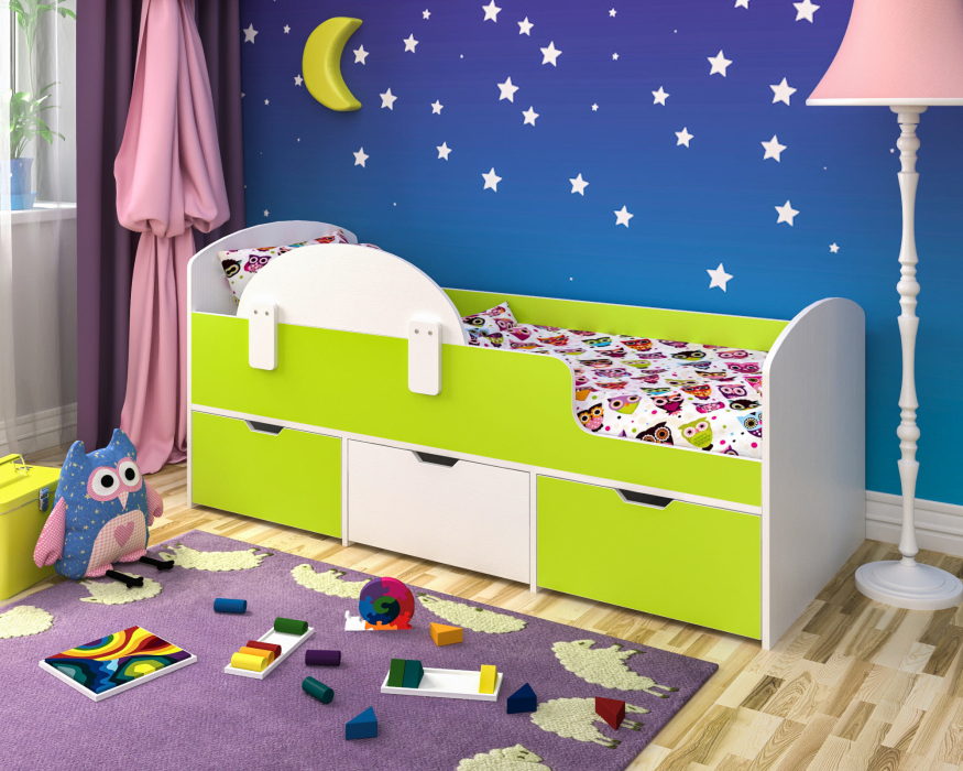 Кровать «Малыш Мини», представленная в каталоге мебели фабрики ЯРОФФ, удачно впишется в интерьер комнаты мальчика. Она выполнена в разнообразных цветах, среди которых легко можно подобрать наиболее подходящий к интерьеру комнаты и тот, который больше всего понравится ее владельцу. Небольшие компактные размеры позволят размесить ее в комнате даже с небольшой площадью, она легко встанет у стены и не будет загромождать пространство. При этом у кровати «Малыш Мини» имеются нижние вместительные ящики для хранения постельного белья, игрушек или других вещей. А также предусмотрен бортик для обеспечения безопасности во время детского сна, чтобы ребенок не выпал из кроватки.