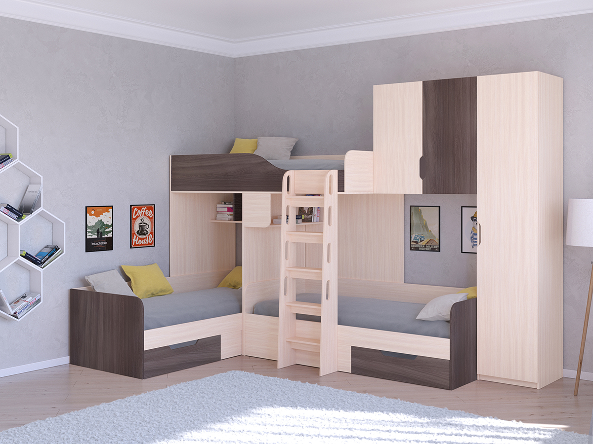 Двухъярусная кровать Трио/2 является субкомпактным вариантом размещения сразу трех детей. За счет углового исполнения она позволит сэкономить полезное пространство в комнате. Но относительно компактные размеры не сказались на функционале - кровать обладает тремя полноценными спальными местами, а так же полочками и ящиками. В отличии от базовой версии кровати данная модель дополнена высоким пеналом с пятью полками и вместительной антресолью. Благодаря этому можно с удобством хранить еще больше вещей.