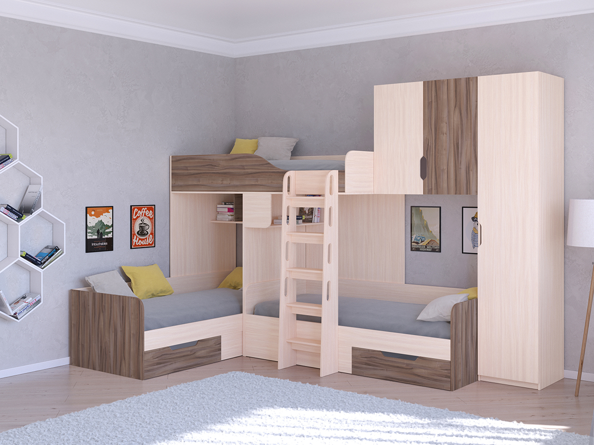 Двухъярусная кровать Трио/2 является субкомпактным вариантом размещения сразу трех детей. За счет углового исполнения она позволит сэкономить полезное пространство в комнате. Но относительно компактные размеры не сказались на функционале - кровать обладает тремя полноценными спальными местами, а так же полочками и ящиками. В отличии от базовой версии кровати данная модель дополнена высоким пеналом с пятью полками и вместительной антресолью. Благодаря этому можно с удобством хранить еще больше вещей.