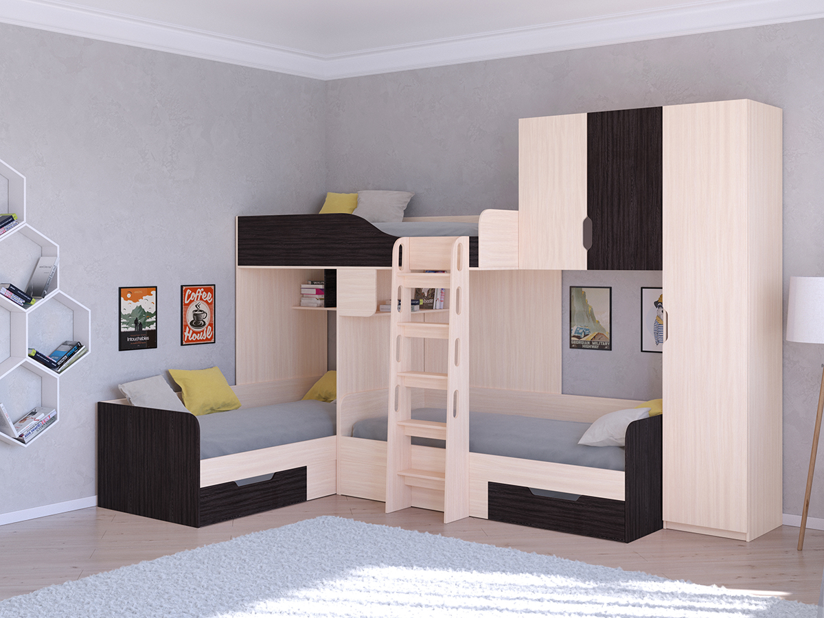 Двухъярусная кровать Трио/2 является субкомпактным вариантом размещения сразу трех детей. За счет углового исполнения она позволит сэкономить полезное пространство в комнате. Но относительно компактные размеры не сказались на функционале - кровать обладает тремя полноценными спальными местами, а так же полочками и ящиками. В отличии от базовой версии кровати данная модель дополнена высоким пеналом с пятью полками и вместительной антресолью. Благодаря этому можно с удобством хранить еще больше вещей.