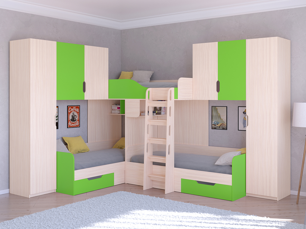 Двухъярусная кровать Трио/3 является субкомпактным вариантом размещения сразу трех детей. За счет углового исполнения она позволит сэкономить полезное пространство в комнате. Но относительно компактные размеры не сказались на функционале - кровать обладает тремя полноценными спальными местами, а так же полочками и ящиками. В отличии от базовой версии кровати данная модель дополнена двумя высокими пеналами с пятью полками и двумя вместительными антресолями. Благодаря этому можно с удобством хранить еще больше вещей.