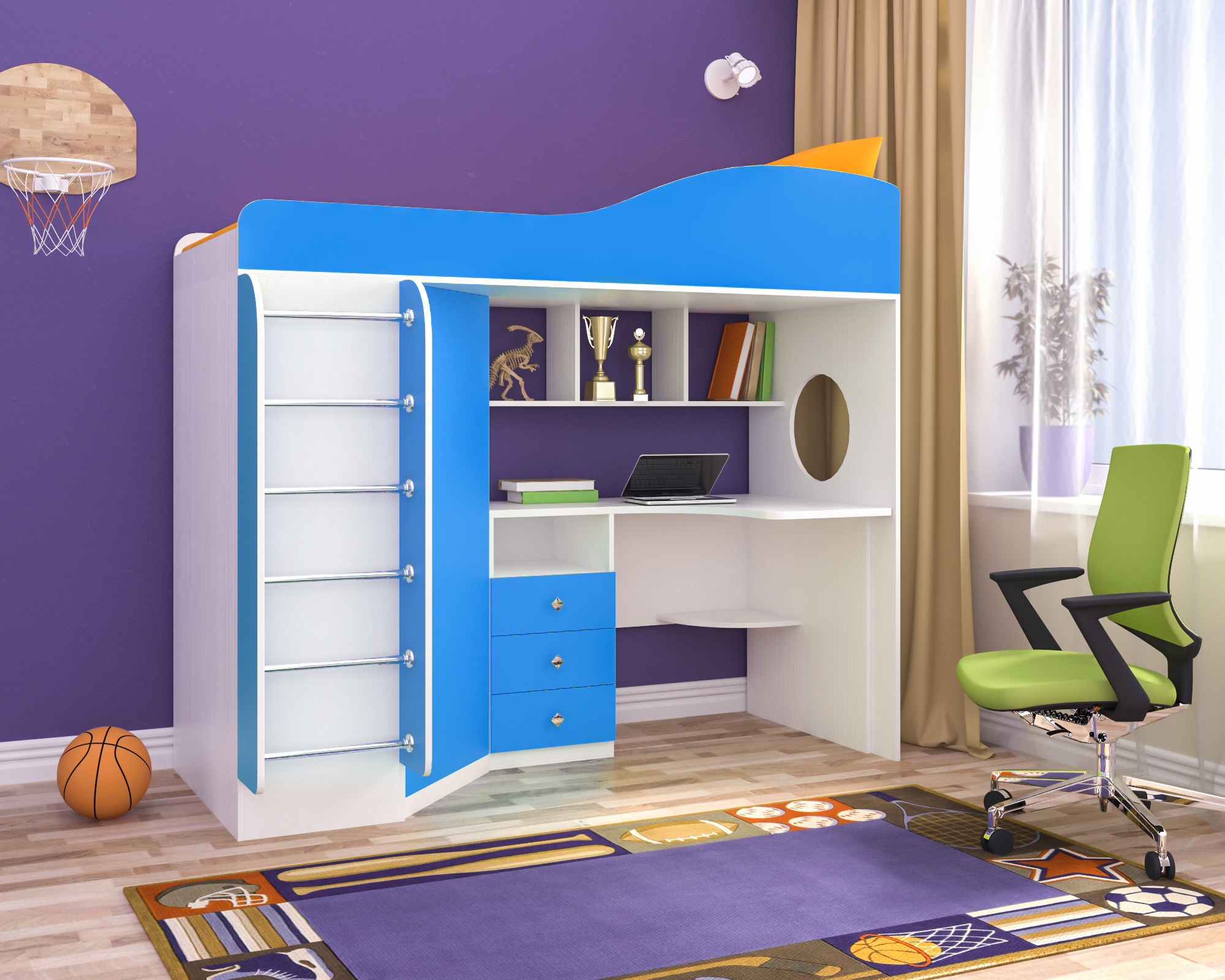 Кровать-чердак Кадет-1 с металлической лестницей — это универсальное решение для детской комнаты, так как помимо комфортного спального места в ней предусмотрено рабочее пространство с письменным столом, навесными полками над столешницей и выдвижными ящиками под столом для хранения канцелярских принадлежностей, книг и других мелочей. Для одежды предусмотрен удобный угловой встроенный шкаф.