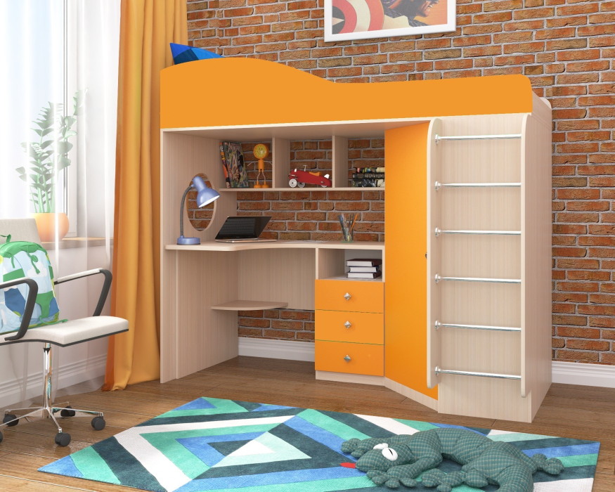 Кровать-чердак Кадет-1 с металлической лестницей — это универсальное решение для детской комнаты, так как помимо комфортного спального места в ней предусмотрено рабочее пространство с письменным столом, навесными полками над столешницей и выдвижными ящиками под столом для хранения канцелярских принадлежностей, книг и других мелочей. Для одежды предусмотрен удобный угловой встроенный шкаф.