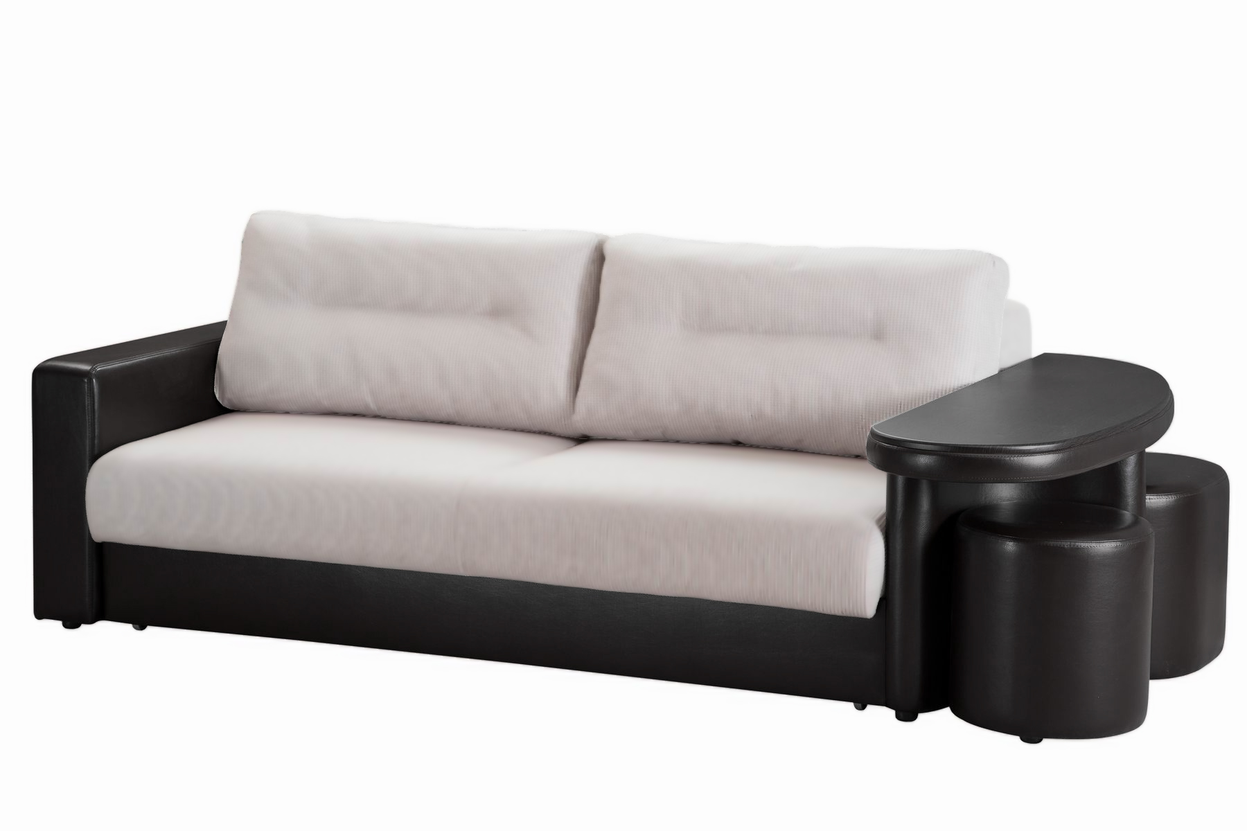 Диван с удобным широким столом-подлокотником. В комплект входят 2 пуфа. Отличное решение для гостиной.Сантана 4 — это практичная и многофункциональная модель: отлично подойдет для небольшой квартиры. Так как может служить и диваном и полноценным спальным местом; станет центром отдыха в вашей гостиной. На ней удобно разместить большую компанию или просто посмотреть телевизор после рабочего дня. Подойдет для семьи с детьми (подушки спинки дивана наполнены пухом «комфорель» — гипоаллергенным заменителем лебяжьего пуха). Детям нравятся диваны с подушками. У этого дивана есть удобный широкий стол–подлокотник. Стол-подлокотник делает этот диван еще более функциональным: на нем удобно выпить с друзьями кофе, установить ноутбук или собраться большой компанией за просмотром фильма, а на столе разместить напитки и закуски.