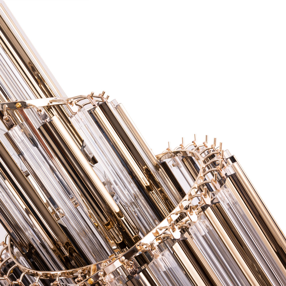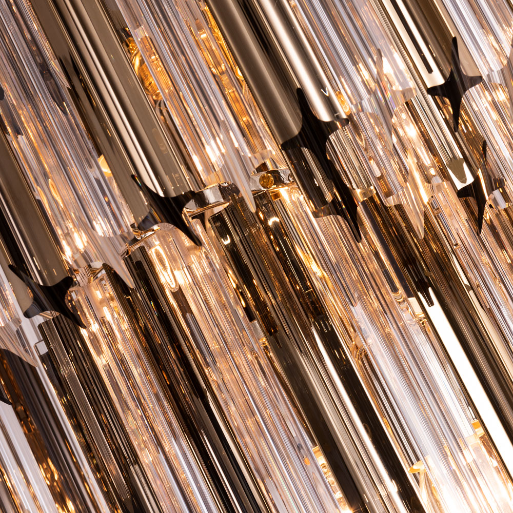 Свободно свисающие хрустальные декоративные элементы, расположенные в несколько рядов, образуют объемную конструкцию, которая при движении воздуха в помещении начинает «звучать». Сочетание золотых и прозрачных декоративных подвесок создают яркий, ослепительный образ модели. В коллекции четыре люстры разных размеров, есть возможность подобрать в помещения разных форматов. Большое бра может быть дополнением в ансамбль с люстрой, а может быть самостоятельным украшением интерьера. Характеристики: Материал: металл/хрусталь. Мощность лампы: 60W. Напряжение: 220V. Патрон: E14. Стиль лампы: Дизайнерский. Количество патронов: 11. Лампы в комплекте: Нет. Крепеж: на крюк.