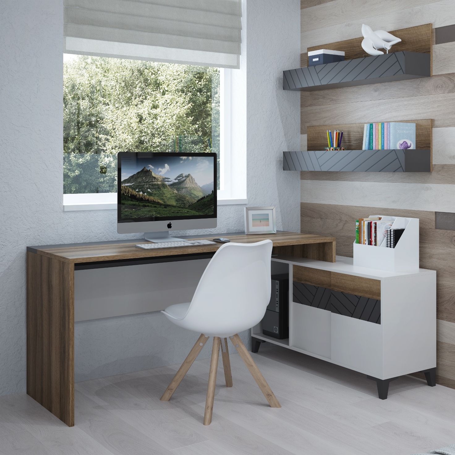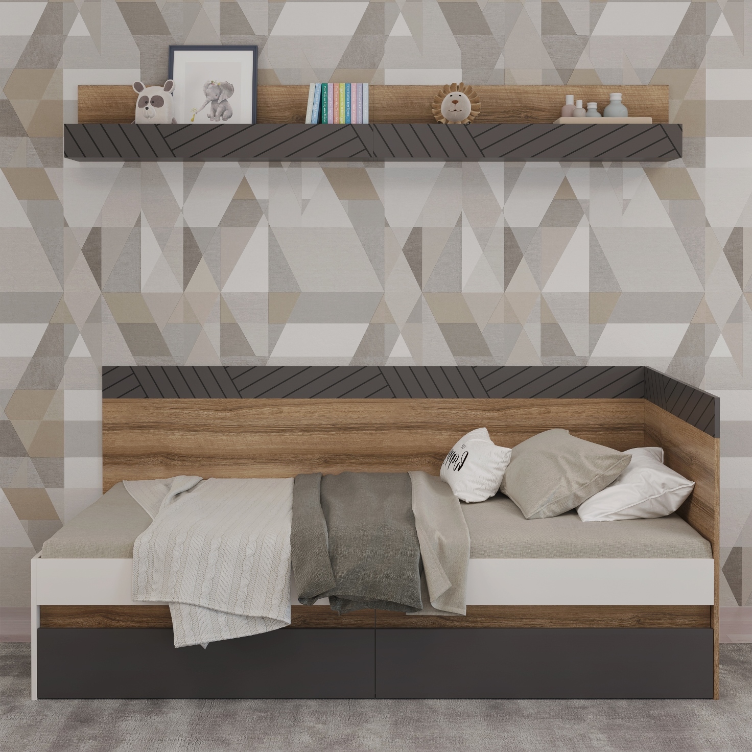 Коллекция Гринвич – сочетание стильных и функциональных модулей для подростковой комнаты, которые впишутся в любой по стилю интерьер. Полка исполнена в модном цветовом сочетании авелано-темно-серый с геометрическим принтом на фасадах, который подчеркивает современный стиль всей коллекции.