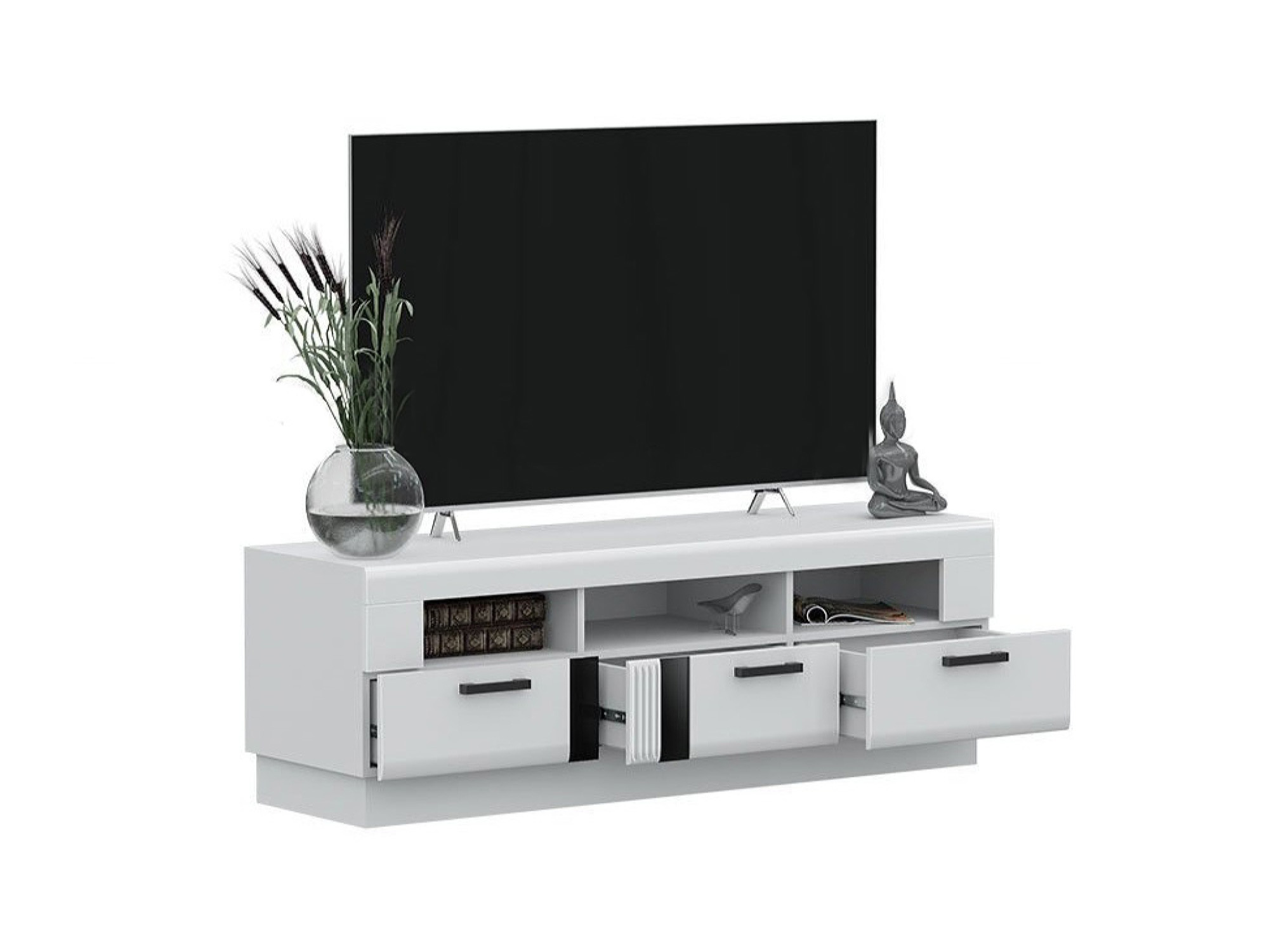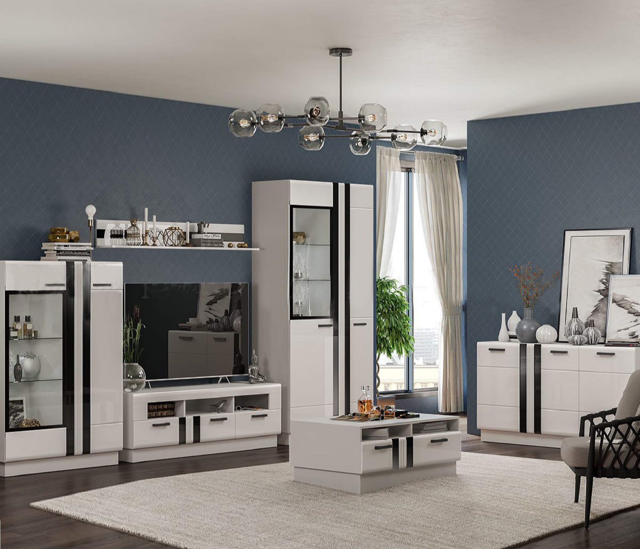 Модульная гостиная Магнолия — мебель в Скандинавском стиле, с закругленными краями фасадов, декорированная вертикальными черными полосами Лакобель с фрезеровкой. Лаконичный, но очень выразительный дизайн. Серия Магнолия включает модули для обустройства гостиной или спальни. Представлен широкий выбор модулей.