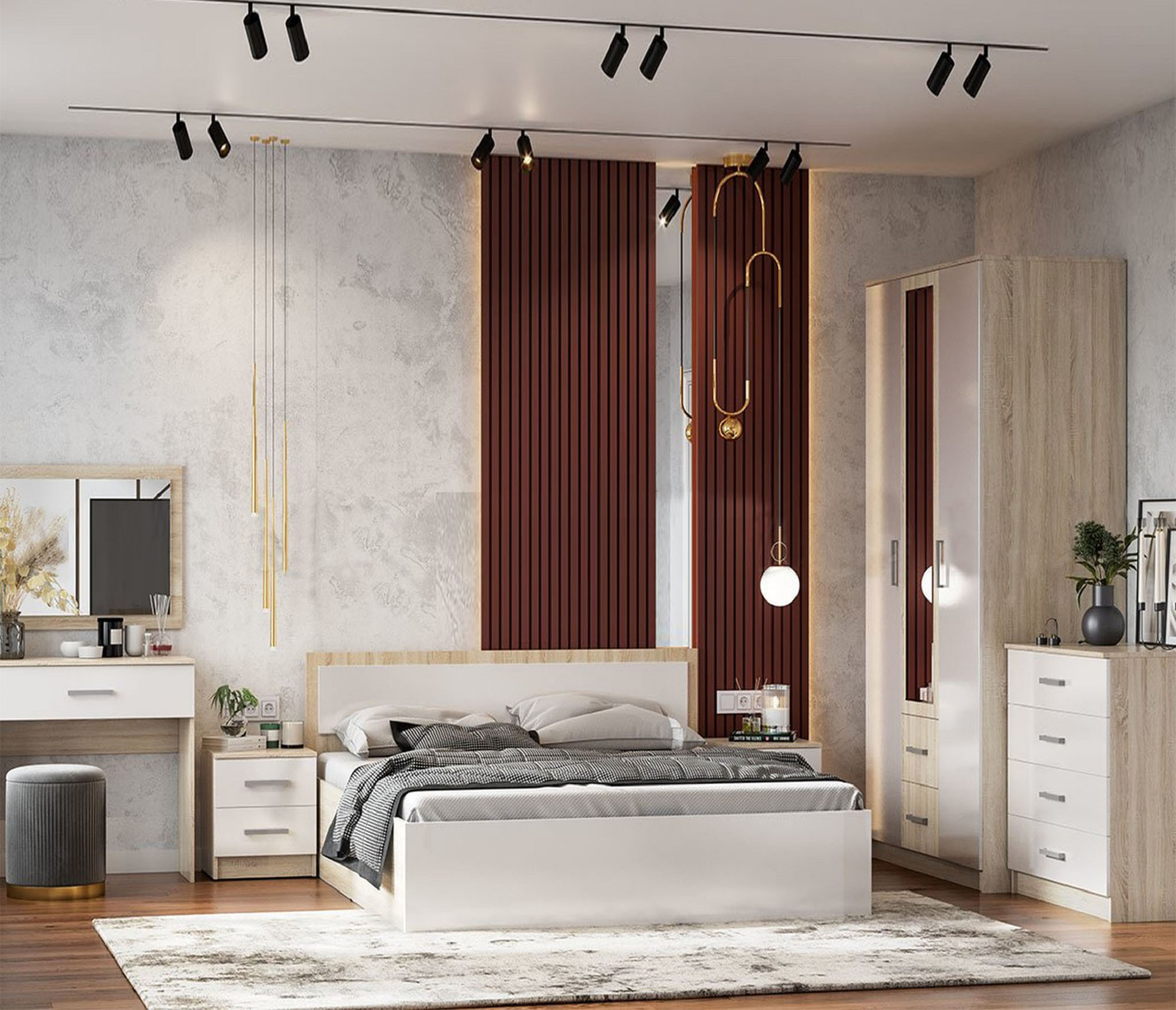 Модульная спальня Мартина — модульная серия в сочетании светлого древесного декора Сонома и Белого глянца. Мебель изготовлена из ЛДСП.