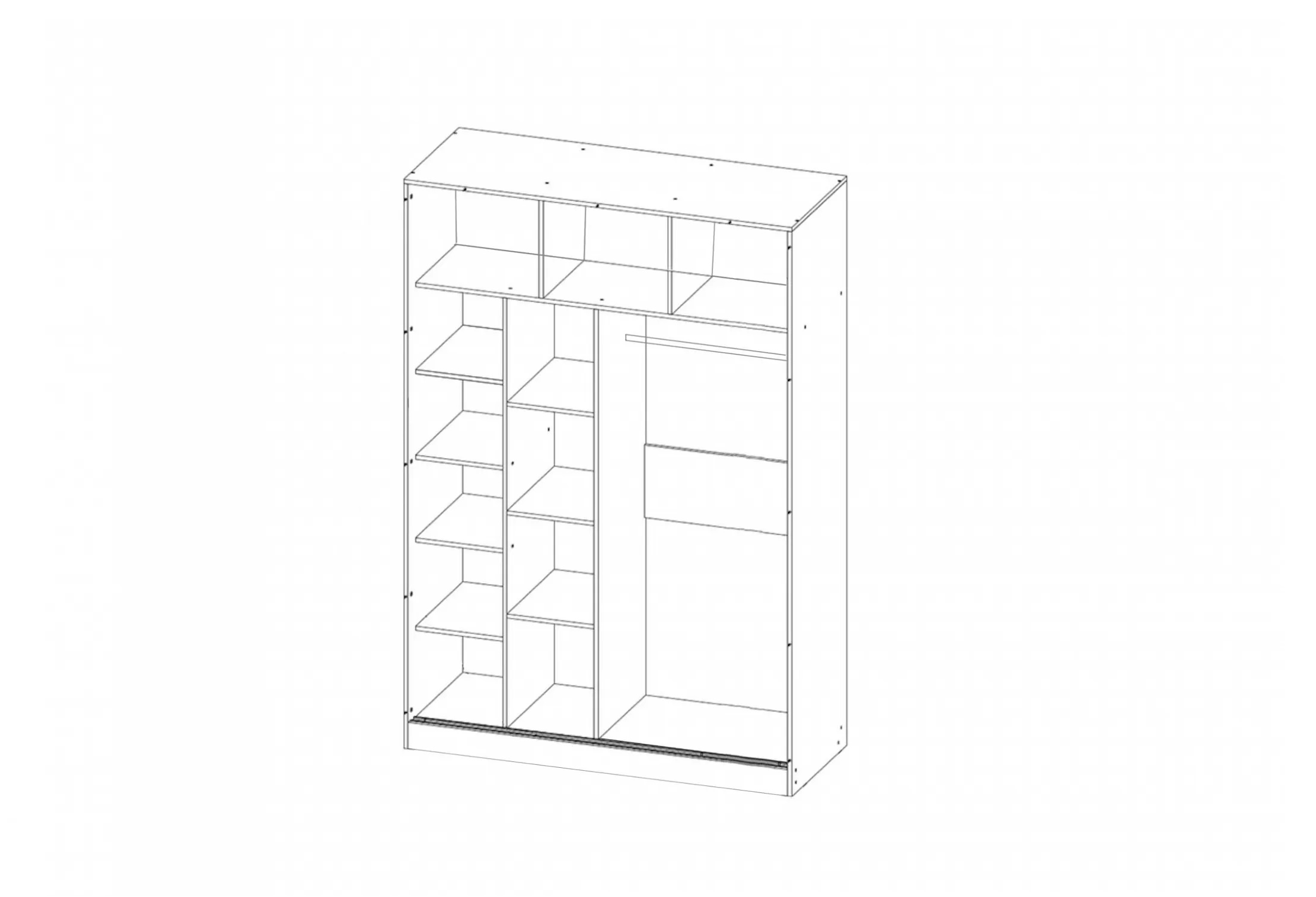 Соренто спальня Шкаф-купе — модель с 3 отделениями. Большее отделение, занимающее половину пространства, укомплектовано штангой, два отделения с полками укомплектованы 7 полками. Верхняя часть представляет собой трехсекционную антресольную полку. Фасады — с зеркалом.