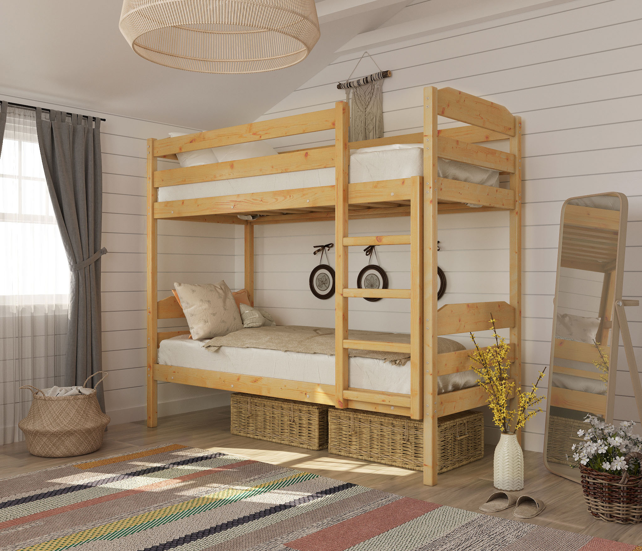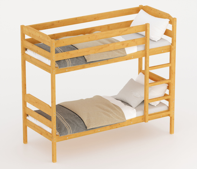 Прочная и стильная двухъярусная кровать Конти с высокими и безопасными бортами на втором ярусе, изготавливается из массива хвойных пород дерева. Тип крепления – болт/бобышка, позволяющий быстро и прочно собирать/разбирать кровать.