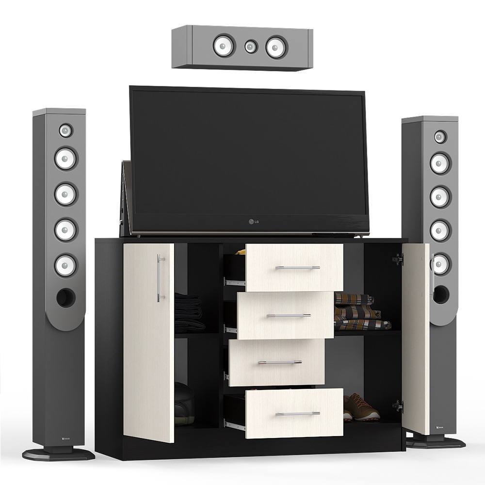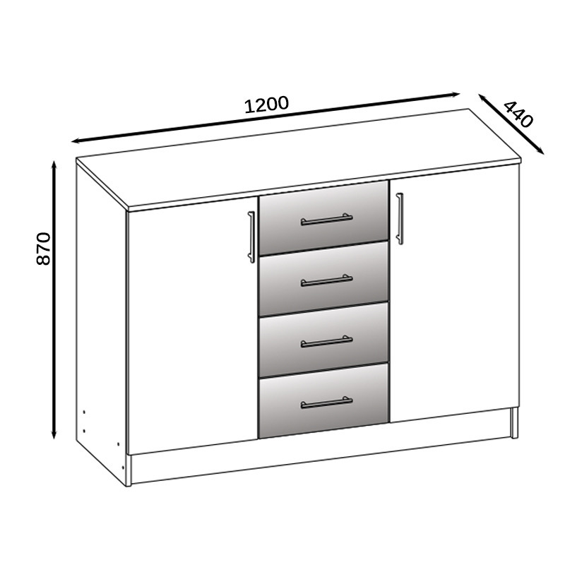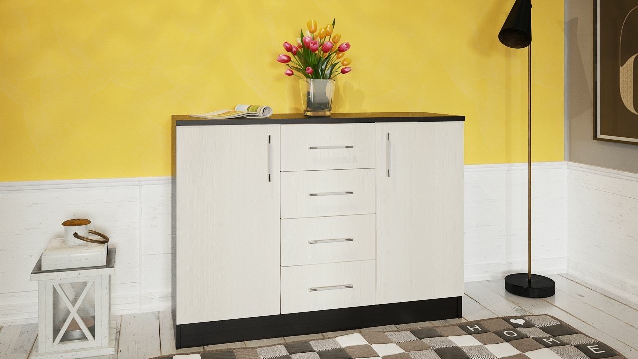 В данной модели объединены модное сочетание контрастных цветов, удобная конструкция, вместительность и приятная цена. Комод имеет три равной ширины части и симметричную сборку. Центральная часть - это четыре выдвижных ящика. По бокам расположены закрытые распашными дверками ниши с одной полочкой в каждой. Стильные ручки реллинги, выполненные в сочетании цвета хромированного и матового металла, украшают фасады комода. Универсальность комода заключается в его предназначении, которое выбираете исключительно Вы. Комод пригодится в квартире, дома и в офисе, на даче, в учебном или государственном учреждении. Ящики закреплены на металлических роликовых направляющих, обеспечивающих прямой, лёгкий ход. Корпус и фасады выполнены из ламинированной ДСП 16 мм., края закромлены плёнкой ПВХ. Поставляется в разобранном виде, надёжно упакованным, в комплекте с фурнитурой и инструкцей по сборке.