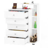 Классическая форма комода с пятью выдвижными ящиками креативно дополнена узкой открытой нишей с тремя полками и верхней полочкой. Ящики расположены с левой стороны комода, закреплены на металлических роликовых направляющих, обеспечивающих прямой, лёгкий ход. Универсальная сборка не предусмотрена.Фурнитура высоких стандартов. Ящики закреплены на металлических роликовых направляющих, обеспечивающих прямой, лёгкий ход. В производстве спальни Камелия использована фурнитура высоких стандартов, ящики модулей установлены на роликовые направляющие. Выполнен из ЛДСП мм, края закромлены плёнкой ПВХ, хромированная труба 25 мм. Поставляется в разобранном виде, надёжно упакованным, в комплекте с фурнитурой и инструкцией по сборке. Элемент из набора мебели для спальни Камелия.