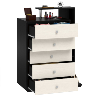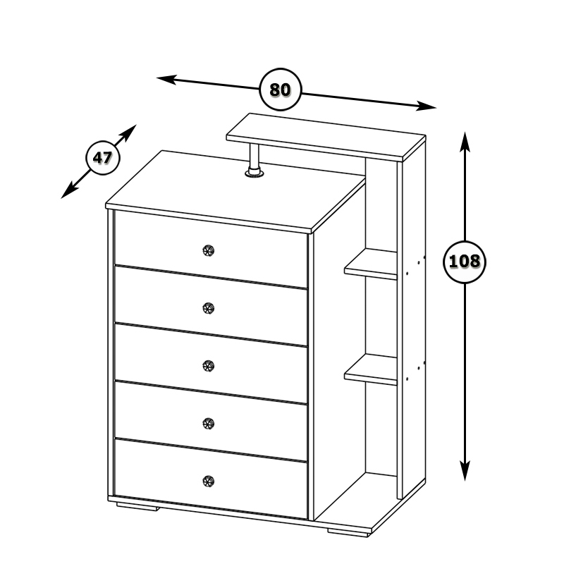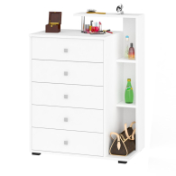 Классическая форма комода с пятью выдвижными ящиками креативно дополнена узкой открытой нишей с тремя полками и верхней полочкой. Ящики расположены с левой стороны комода, закреплены на металлических роликовых направляющих, обеспечивающих прямой, лёгкий ход. Универсальная сборка не предусмотрена.Фурнитура высоких стандартов. Ящики закреплены на металлических роликовых направляющих, обеспечивающих прямой, лёгкий ход. В производстве спальни Камелия использована фурнитура высоких стандартов, ящики модулей установлены на роликовые направляющие. Выполнен из ЛДСП мм, края закромлены плёнкой ПВХ, хромированная труба 25 мм. Поставляется в разобранном виде, надёжно упакованным, в комплекте с фурнитурой и инструкцией по сборке. Элемент из набора мебели для спальни Камелия.