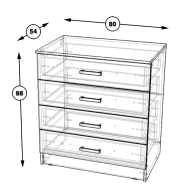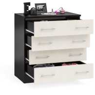 Вместительный комод с четырьмя выдвижными ящиками - традиционный элемент гардеробного комплекса для аккуратного хранение белья и вещей. Высота комода Фиеста позволяет использовать его в составе дамского уголка красоты в качестве подзеркальника. Фурнитура высоких стандартов. Ящики закреплены на металлических роликовых направляющих, обеспечивающих прямой, лёгкий ход. Корпус и фасады выполнены из ЛДСП 16 мм., края закромлены плёнкой ПВХ. Поставляется в разобранном виде, надёжно упакованным, в комплекте с фурнитурой и инструкцией по сборке. Элемент из набора мебели для спальни Фиеста.