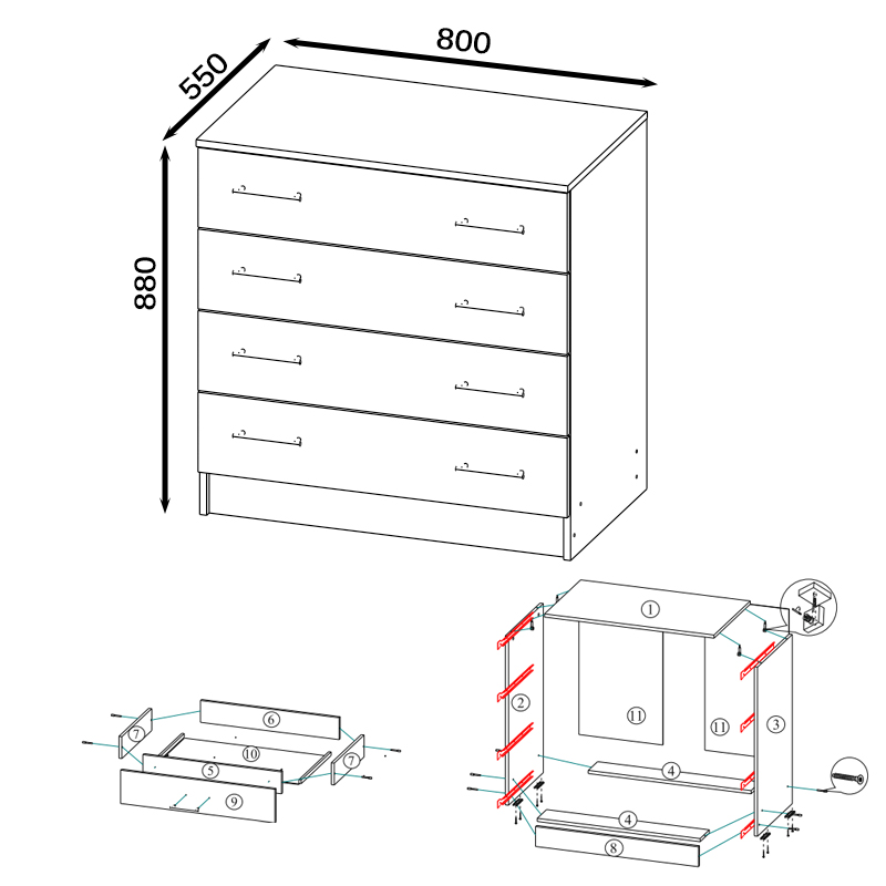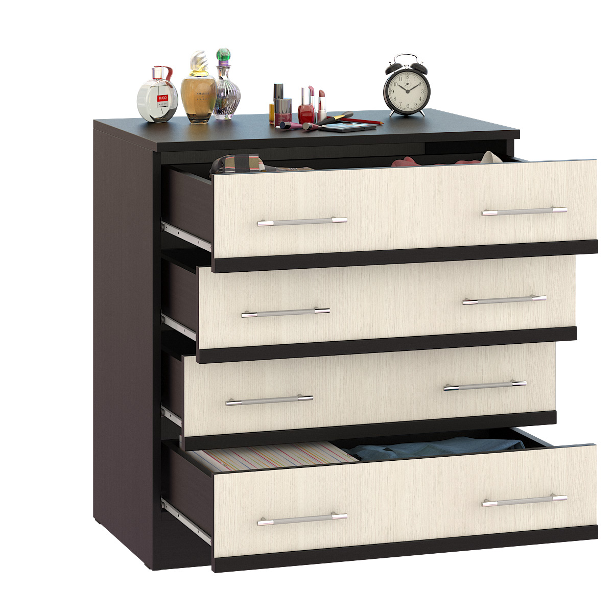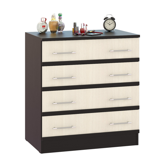 Стильный комод с четырьмя выдвижными ящиками - традиционная система хранения белья и деликатных вещей. Удобная высота комода Сакура позволяет использовать его в составе дамского уголка красоты в качестве подзеркальника. Маленькая детская, дамский будуар, большая семейная спальня - везде комод Сакура поддержит изысканный интерьер в модных тонах. Классика прямых форм и лаконичность стиля комода Сакура эффектно дополнена контрастной цветовой гаммой и стильными ручками. Фурнитура самых высоких стандартов. Выполнен из ЛДСП 16 и 22 мм, края закромлены плёнкой ПВХ. Поставляется разобранном виде в надёжной упаковке, с комплектом фурнитуры и инструкцией по сборке. Элемент из набора мебели для спальни Сакура.