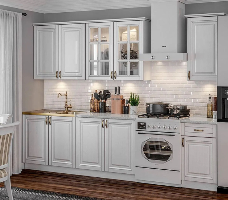 Кухня Престиж — мебель в стиле Прованс, создает атмосферу благополучия, стабильности и хорошего настроения. Кухня обладает существенным преимуществом: верхние шкафы имеют высоту 900 мм, что делает помещение выше и увеличивает место для хранения на 180 мм в высоту. Кухня Престиж предлагается гарнитуром, но при желании его можно дополнить модулями складской программы, ассортимент, габариты и цену которых для вас уточнят консультанты магазина. Корпуса модулей изготовлены из ЛДСП Белого цвета, фасад МДФ Шервуд жемчуг, столешница 26 мм толщиной в цвете Антарес.