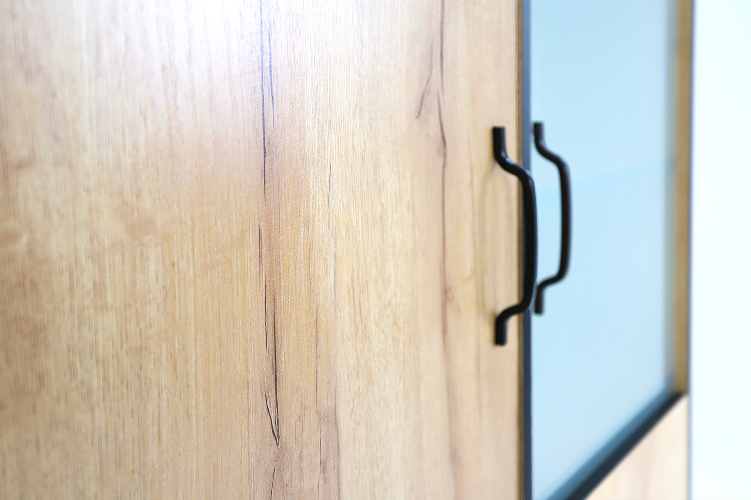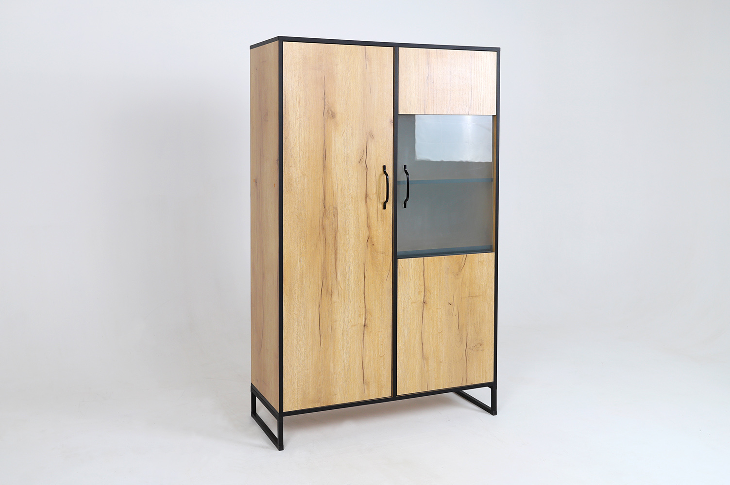 Шкаф-витрина Виртон имеет универсальную сборку и вставку из белого матового стекла. Внутри него находится десять больших полок.