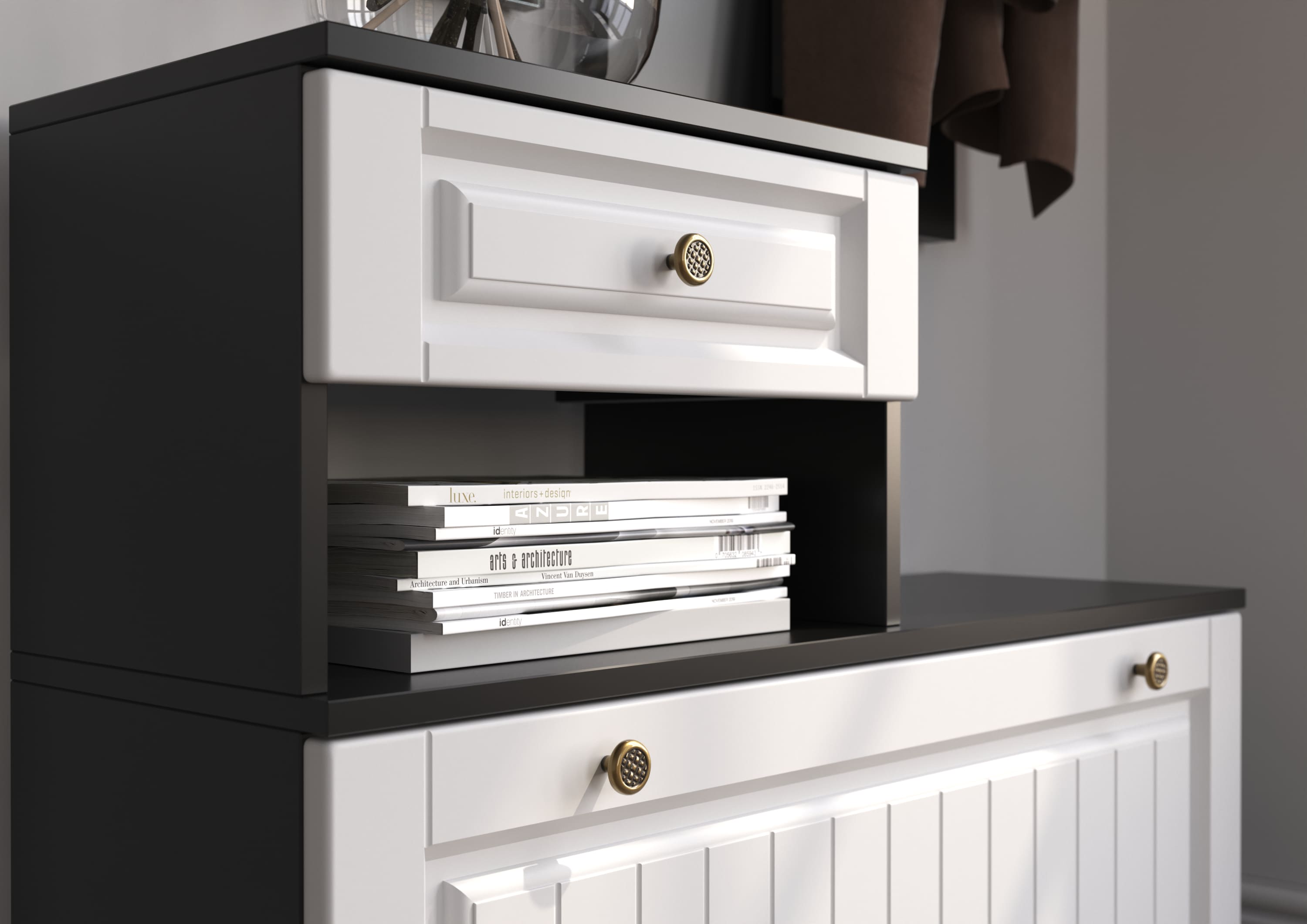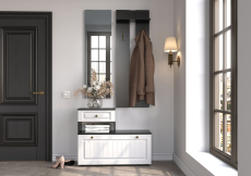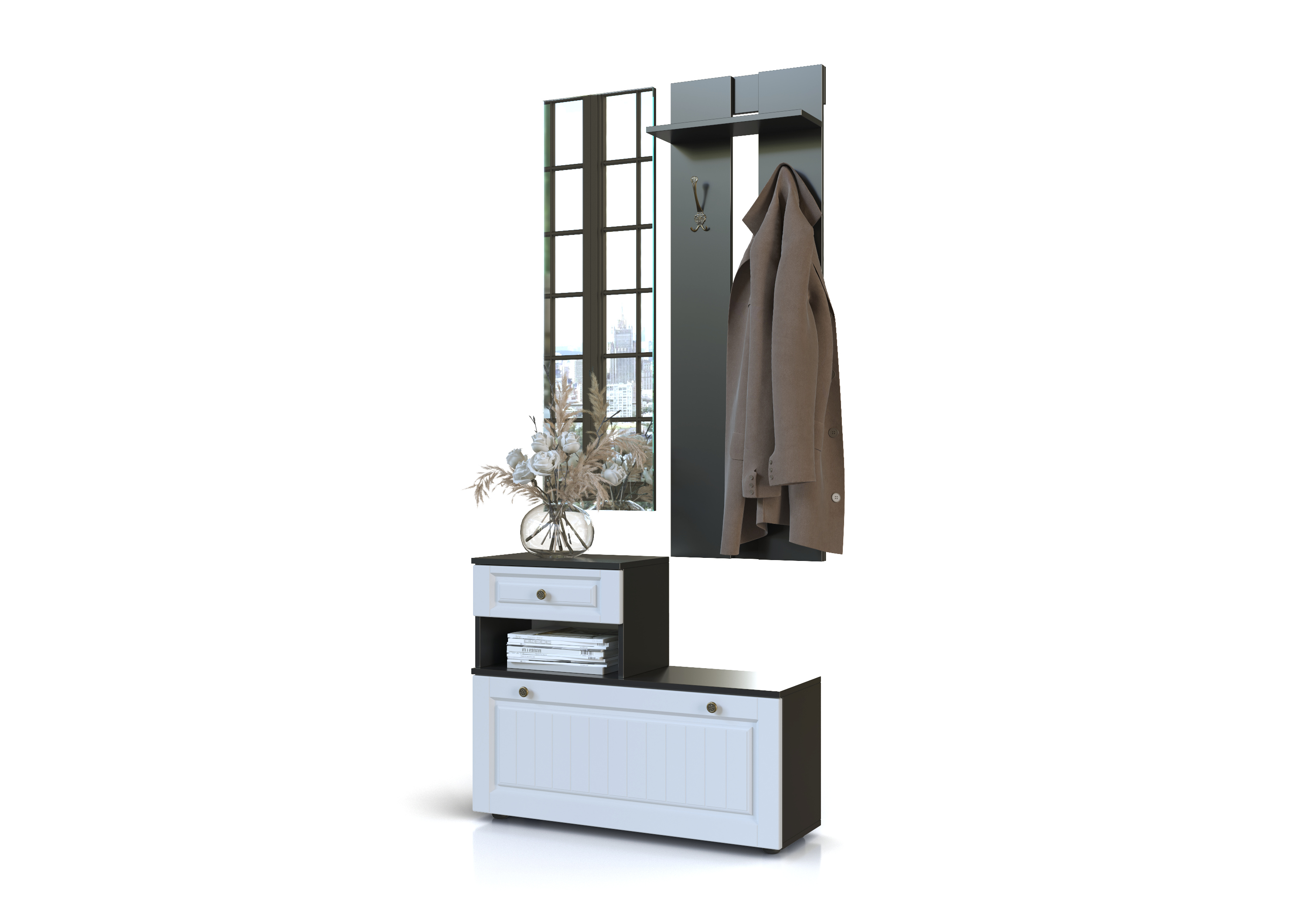 Корпус прихожей изготовлен из ЛДСП в цвете чёрный, фасады из МДФ в цвете белый матовый. Габаритные размеры (Ш*В*Г): 900 х 2016 х 270 мм