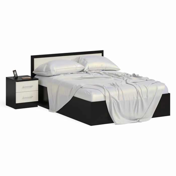 Компактная двуспальная кровать с нейтральным дизайном, впишется в комнату любого размера и стиля. Спальное место кровати имеет размер 1400х2000 мм, основание под матрас в комплекте (настил ДСП), матрас приобретается отдельно. Компактная тумба прикроватная с двумя выдвижными ящиками - элемент системы хранения, подставка для светильника, модный декор. Фурнитура высоких стандартов. Ящики закреплены на металлических роликовых направляющих, обеспечивающих прямой, лёгкий ход. Выполнены из ЛДСП, края закромлены плёнкой ПВХ. Поставляется в разобранном виде, надёжно упакованным, в комплекте с фурнитурой и инструкцией по сборке. Элементы из набора мебели для спальни Фиеста.