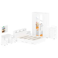 Спальня состоит из кровати с ящиками 1600, двух тумб, стола косметического с зеркалом, комода и шкафа 4-х створчатого. Удобная кровать с трёхсторонним доступом к спальному месту размером 1600х2000 мм. - стильный подиум для комфортного отдыха. В основании кровати расположены два вместительных ящика для хранения постельных принадлежностей и личных вещей. Предусмотрена универсальная схема сборки бельевых ящиков - они могут быть установлены с правой или с левой стороны кровати. Основание под матрас в комплекте (настил ДСП), матрас приобретается отдельно. Комплект из двух прикроватных тумб Камелия в правом и левом исполнении - креативный подход к оформлению зоны отдыха. Компактный столик, глубиной всего 40 см., с двумя выдвижными ящиками, открытой нишей и удобной столешницей на хромированной стойке. Ящики и стойка расположены с левой стороны стола. Универсальная сборка не предусмотрена. Большое, нарядное зеркало повысит уровень комфорта в спальне, оживит интерьер магией блеска и света.