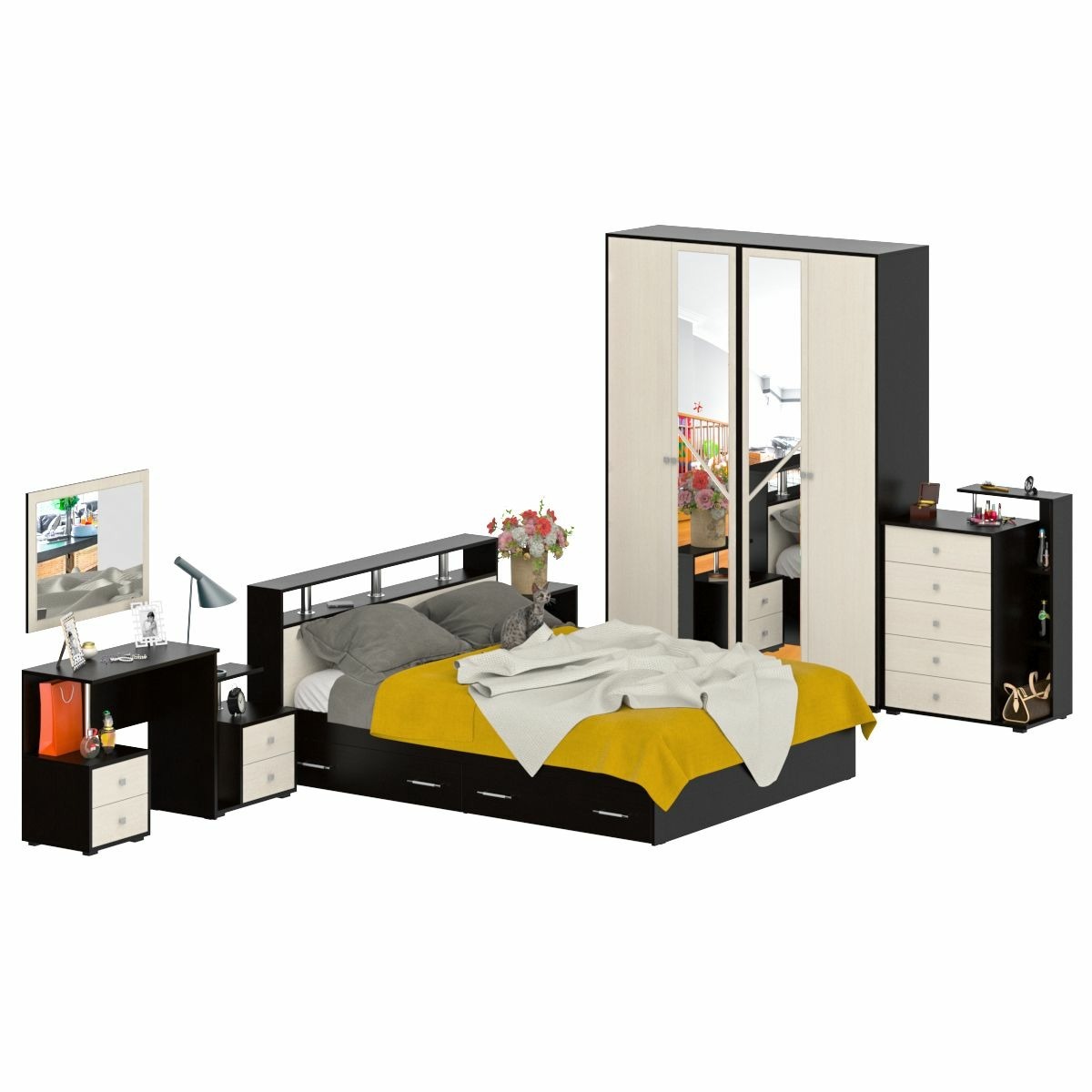 Спальня состоит из кровати с ящиками 1600, двух тумб, стола косметического с зеркалом, комода и шкафа 4-х створчатого. Удобная кровать с трёхсторонним доступом к спальному месту размером 1600х2000 мм. - стильный подиум для комфортного отдыха. В основании кровати расположены два вместительных ящика для хранения постельных принадлежностей и личных вещей. Предусмотрена универсальная схема сборки бельевых ящиков - они могут быть установлены с правой или с левой стороны кровати. Основание под матрас в комплекте (настил ДСП), матрас приобретается отдельно. Комплект из двух прикроватных тумб Камелия в правом и левом исполнении - креативный подход к оформлению зоны отдыха. Компактный столик, глубиной всего 40 см., с двумя выдвижными ящиками, открытой нишей и удобной столешницей на хромированной стойке. Ящики и стойка расположены с левой стороны стола. Универсальная сборка не предусмотрена. Большое, нарядное зеркало повысит уровень комфорта в спальне, оживит интерьер магией блеска и света.