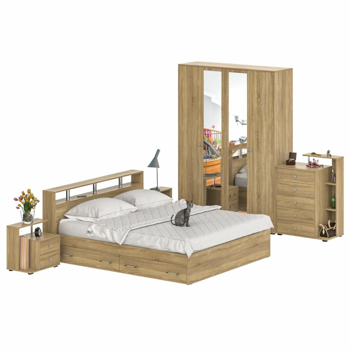 Состоит из кровати с ящиками 1800 с двумя прикроватными тумбами, комода и шкафа 4-х створчатого. Удобная кровать с трёхсторонним доступом к спальному месту размером 1800х2000 мм - стильный подиум для комфортного отдыха. В основании кровати расположены два вместительных ящика для хранения постельных принадлежностей и личных вещей. Предусмотрена универсальная схема сборки бельевых ящиков - они могут быть установлены с правой или с левой стороны кровати. Основание под матрас в комплекте (настил ДСП), матрас приобретается отдельно. Комплект из двух прикроватных тумб Камелия в правом и левом исполнении - креативный подход к оформлению зоны отдыха. Роскошные комод с пятью выдвижными ящиками. Широкий шкаф 4-х створчатый составлен из двух автономных шкафов, которые можно устанавливать отдельно, где Вам удобно! Одно отделение шкафа - для одежды на вешалках, со штангой и двумя полками, второе - для белья и вещей, с четырьмя полками. Центральные дверки шкафа Камелия украшены зеркалами во всю длину двери - дополнительный вклад в эстетику и комфорт спальни. Универсальная сборка шкафа 4-х створчатого Камелия позволяет легко изменять интерьер, без уменьшения декоративности. Фурнитура высоких стандартов. Ящики закреплены на металлических роликовых направляющих, обеспечивающих прямой, лёгкий ход. Выполнена из ЛДСП, края закромлены плёнкой ПВХ, хромированная труба 25. Поставляется в разобранном виде, надёжно упакованным, в комплекте с фурнитурой и инструкцией по сборке.