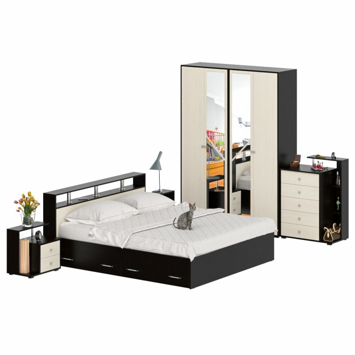 Состоит из кровати с ящиками 1800 с двумя прикроватными тумбами, комода и шкафа 4-х створчатого. Удобная кровать с трёхсторонним доступом к спальному месту размером 1800х2000 мм - стильный подиум для комфортного отдыха. В основании кровати расположены два вместительных ящика для хранения постельных принадлежностей и личных вещей. Предусмотрена универсальная схема сборки бельевых ящиков - они могут быть установлены с правой или с левой стороны кровати. Основание под матрас в комплекте (настил ДСП), матрас приобретается отдельно. Комплект из двух прикроватных тумб Камелия в правом и левом исполнении - креативный подход к оформлению зоны отдыха. Роскошные комод с пятью выдвижными ящиками. Широкий шкаф 4-х створчатый составлен из двух автономных шкафов, которые можно устанавливать отдельно, где Вам удобно! Одно отделение шкафа - для одежды на вешалках, со штангой и двумя полками, второе - для белья и вещей, с четырьмя полками. Центральные дверки шкафа Камелия украшены зеркалами во всю длину двери - дополнительный вклад в эстетику и комфорт спальни. Универсальная сборка шкафа 4-х створчатого Камелия позволяет легко изменять интерьер, без уменьшения декоративности. Фурнитура высоких стандартов. Ящики закреплены на металлических роликовых направляющих, обеспечивающих прямой, лёгкий ход. Выполнена из ЛДСП, края закромлены плёнкой ПВХ, хромированная труба 25. Поставляется в разобранном виде, надёжно упакованным, в комплекте с фурнитурой и инструкцией по сборке.