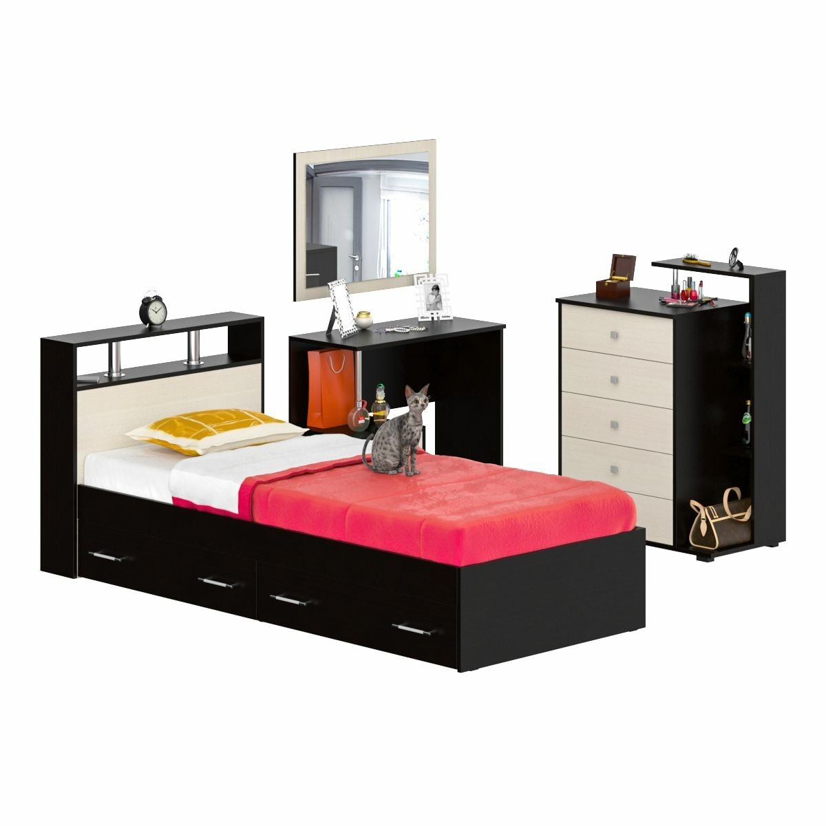 Спальня состоит из кровати с ящиками 900, стола косметического с зеркалом и комода - островок безмятежного наслаждения! Удобная кровать с трёхсторонним доступом к спальному месту размером 900х2000 мм - стильный подиум для комфортного отдыха. В основании кровати расположены два вместительных ящика для хранения постельных принадлежностей и личных вещей. Предусмотрена универсальная схема сборки бельевых ящиков - они могут быть установлены с правой или с левой стороны кровати. Основание под матрас в комплекте кровати (настил ДСП), матрас приобретается отдельно. Компактный столик, глубиной всего 40 см., с двумя выдвижными ящиками, открытой нишей и удобной столешницей на хромированной стойке. Ящики и стойка расположены с левой стороны стола. Универсальная сборка не предусмотрена. Большое, нарядное зеркало повысит уровень комфорта в спальне, оживит интерьер магией блеска и света. Классическая форма комода с пятью выдвижными ящиками креативно дополнена узкой открытой нишей с тремя полками и верхней полочкой. Ящики расположены с левой стороны комода. Универсальная сборка не предусмотрена. Фурнитура высоких стандартов. Ящики закреплены на металлических роликовых направляющих, обеспечивающих прямой, лёгкий ход. Выполнена из ЛДСП, края закромлены плёнкой ПВХ, хромированная труба 25. Поставляется в разобранном виде, надёжно упакованным, в комплекте с фурнитурой и инструкцией по сборке.