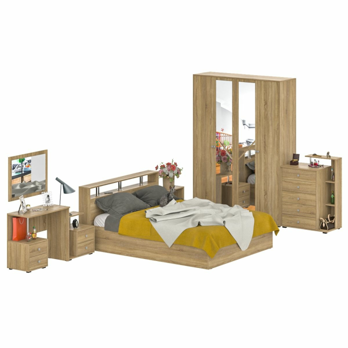 Состоит гарнитур из двухспальной кровати 1600 с двумя прикроватными тумбами, стола косметического с зеркалом, комода и шкафа 4-х створчатого. Удобная кровать с оригинальным изголовьем, декорированным хромированными деталями, станет основой респектабельного интерьера. Спальное место размером 1600х2000 мм, основание под матрас в комплекте (настил ДСП), матрас приобретается отдельно. Комплект из двух прикроватных тумб Камелия в правом и левом исполнении - креативный подход к оформлению зоны отдыха. Стол косметический с зеркалом - мечта достойная Женщины! Компактный столик, глубиной всего 40 см., с двумя выдвижными ящиками, открытой нишей и удобной столешницей на хромированной стойке. Ящики и стойка расположены с левой стороны стола. Универсальная сборка не предусмотрена. Большое, нарядное зеркало повысит уровень комфорта в спальне, оживит интерьер магией блеска и света. Роскошные комод с пятью выдвижными ящиками и вместительный шкаф 4-х створчатый - очарование интерьера и радость Хозяйки! Широкий шкаф 4-х створчатый составлен из двух автономных шкафов, которые можно устанавливать отдельно, где Вам удобно! Одно отделение шкафа - для одежды на вешалках, со штангой и двумя полками, второе - для белья и вещей, с четырьмя полками. Центральные дверки шкафа украшены зеркалами во всю длину двери - дополнительный вклад в эстетику и комфорт спальни. Универсальная сборка шкафа 4-х створчатого Камелия позволяет легко изменять интерьер, без уменьшения декоративности. Фурнитура высоких стандартов. Ящики закреплены на металлических роликовых направляющих, обеспечивающих прямой, лёгкий ход. Выполнена из ЛДСП, края закромлены плёнкой ПВХ, хромированная труба 25. Поставляется в разобранном виде, надёжно упакованным, в комплекте с фурнитурой и инструкцией по сборке.