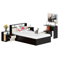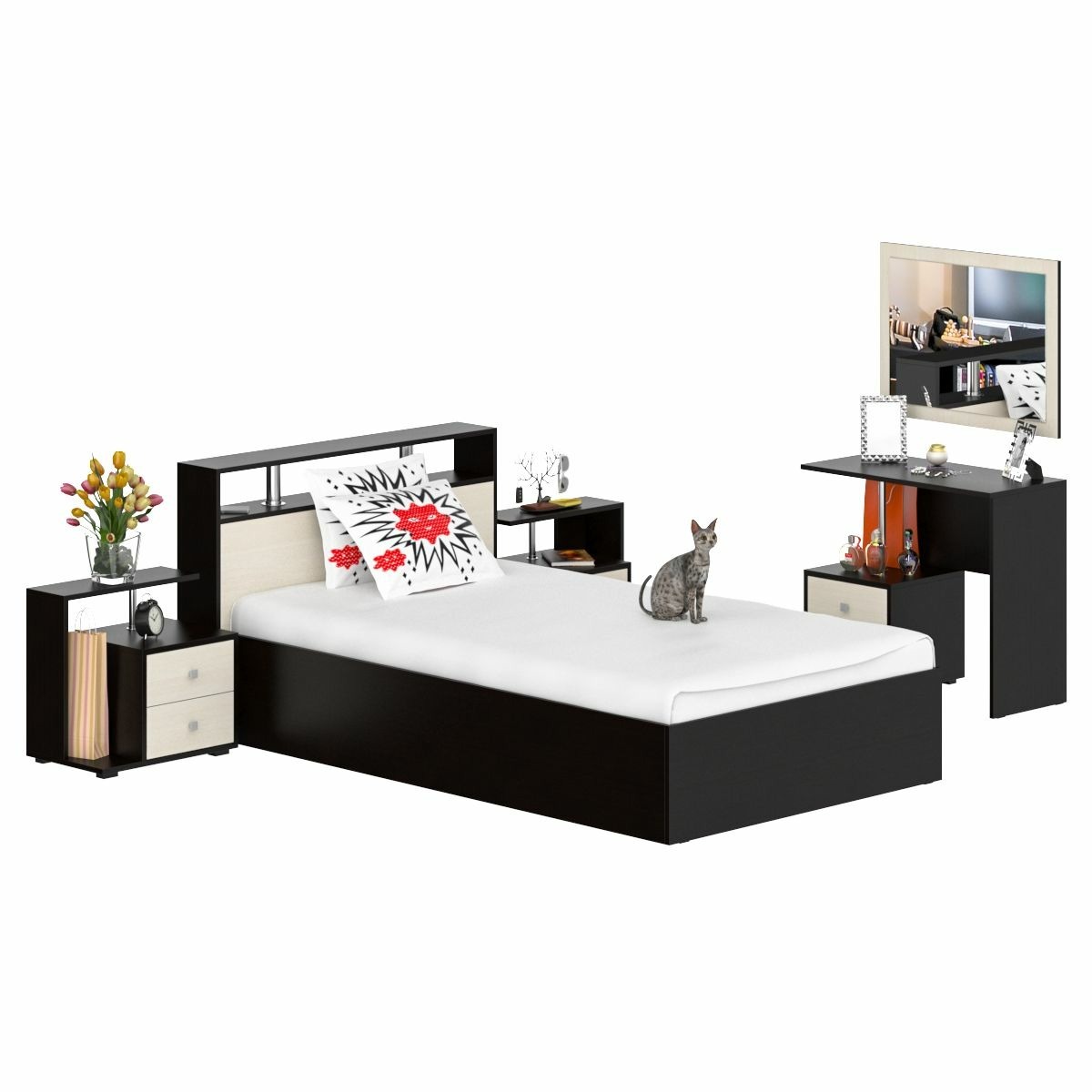 Гарнитур состоит из кровати 1200 с двумя прикроватными тумбами и стола косметического с зеркалом. Интересный стилевой приём гарнитура Камелия - визуальная разгрузка модулей за счёт узких открытых ниш и полочек на хромированных стойках. Удобная кровать с оригинальным изголовьем, декорированным хромированными деталями, станет основой респектабельного интерьера. Спальное место размером 1200х2000 мм., основание под матрас в комплекте (настил ДСП), матрас приобретается отдельно. Комплект из двух прикроватных тумб в правом и левом исполнении - креативный подход к оформлению зоны отдыха. Стильная и эргономически оправданная конструкции тумб добавит интерьеру модного щегольства, а семейной паре удовольствие комфорта. Стол косметический с зеркалом - мечта достойная Женщины! Компактный столик, глубиной всего 40 см., с двумя выдвижными ящиками, открытой нишей и удобной столешницей на хромированной стойке. Ящики и стойка расположены с левой стороны стола. Универсальная сборка не предусмотрена. Большое, нарядное зеркало повысит уровень комфорта в спальне, оживит интерьер магией блеска и света. Фурнитура высоких стандартов. Ящики закреплены на металлических роликовых направляющих, обеспечивающих прямой, лёгкий ход. Выполнена из ЛДСП, края закромлены плёнкой ПВХ, хромированная труба 25. Поставляется в разобранном виде, надёжно упакованным, в комплекте с фурнитурой и инструкцией по сборке.