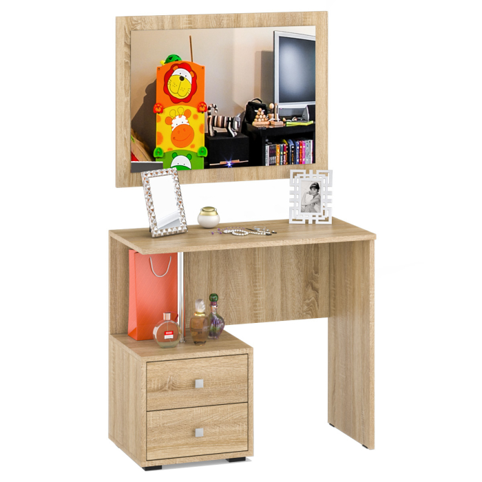 Компактный столик, глубиной всего 40 см., с двумя выдвижными ящиками, открытой нишей и удобной столешницей на хромированной стойке. Ящики и стойка расположены с левой стороны стола. Универсальная сборка не предусмотрена. Большое, нарядное зеркало повысит уровень комфорта в спальне, оживит интерьер магией блеска и света. Фурнитура высоких стандартов. Ящики закреплены на металлических роликовых направляющих, обеспечивающих прямой, лёгкий ход. Корпус и фасады выполнены из ЛДСП 16 мм., края закромлены плёнкой ПВХ. Поставляется в разобранном виде, надёжно упакованным, в комплекте с фурнитурой и инструкцией по сборке. Элементы из набора мебели Камелия.