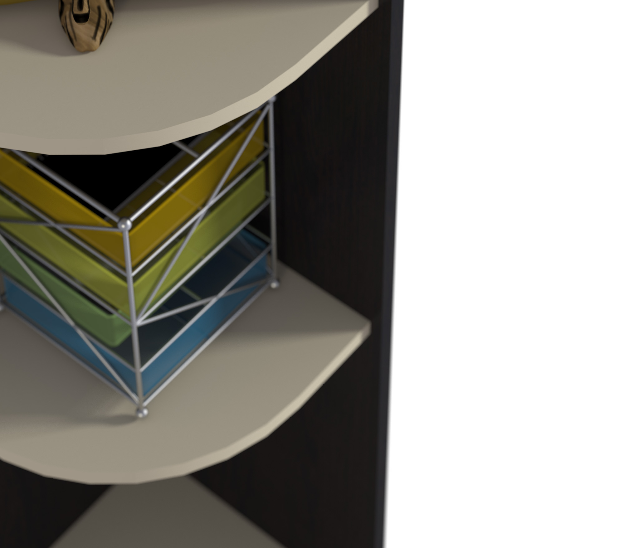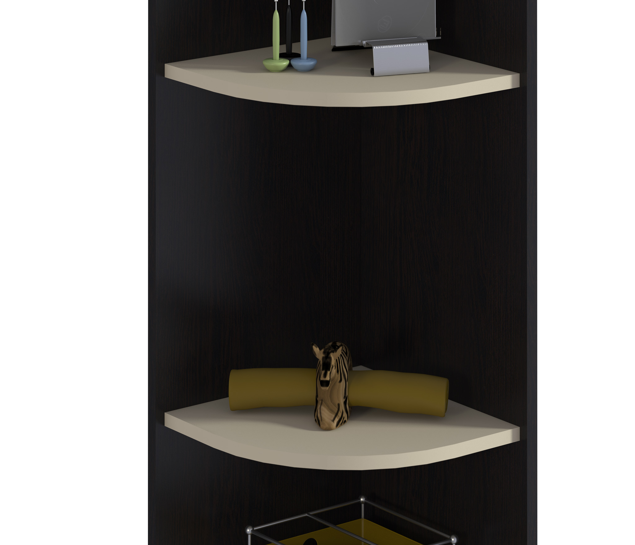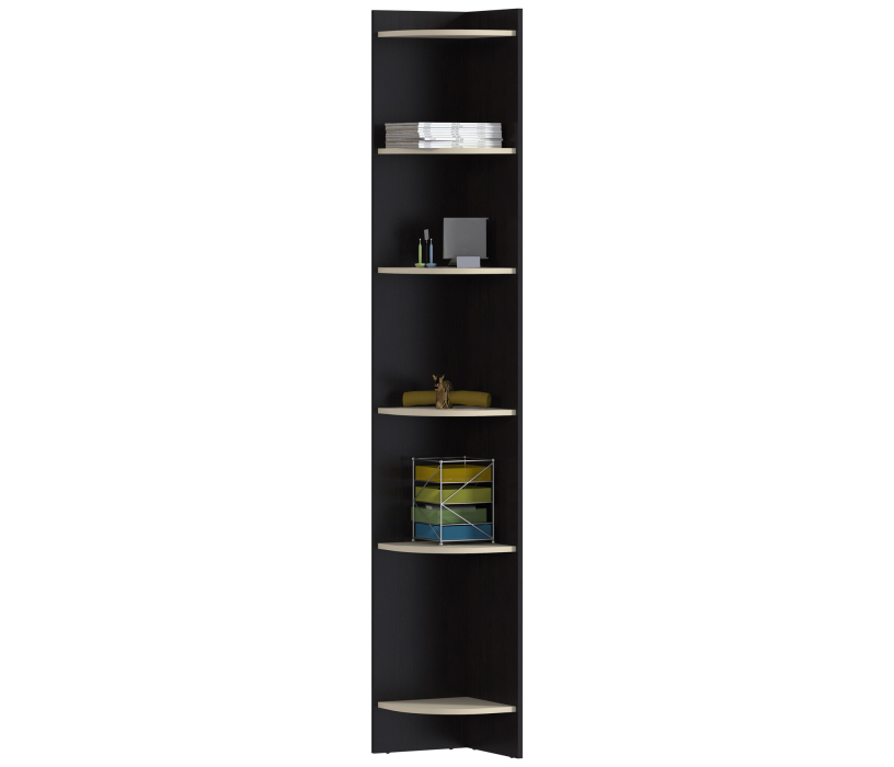 Узкий торцевой стеллаж с открытым фасадом изогнутой формы. Гнутый фасад данного стеллажа смягчает острый угол мебельного гарнитура, облегчая интерьер, при этом он является вместительной и функциональной системой хранения и позволяет вам с удобством разместить все необходимые вещи. Имеет шесть полок.
