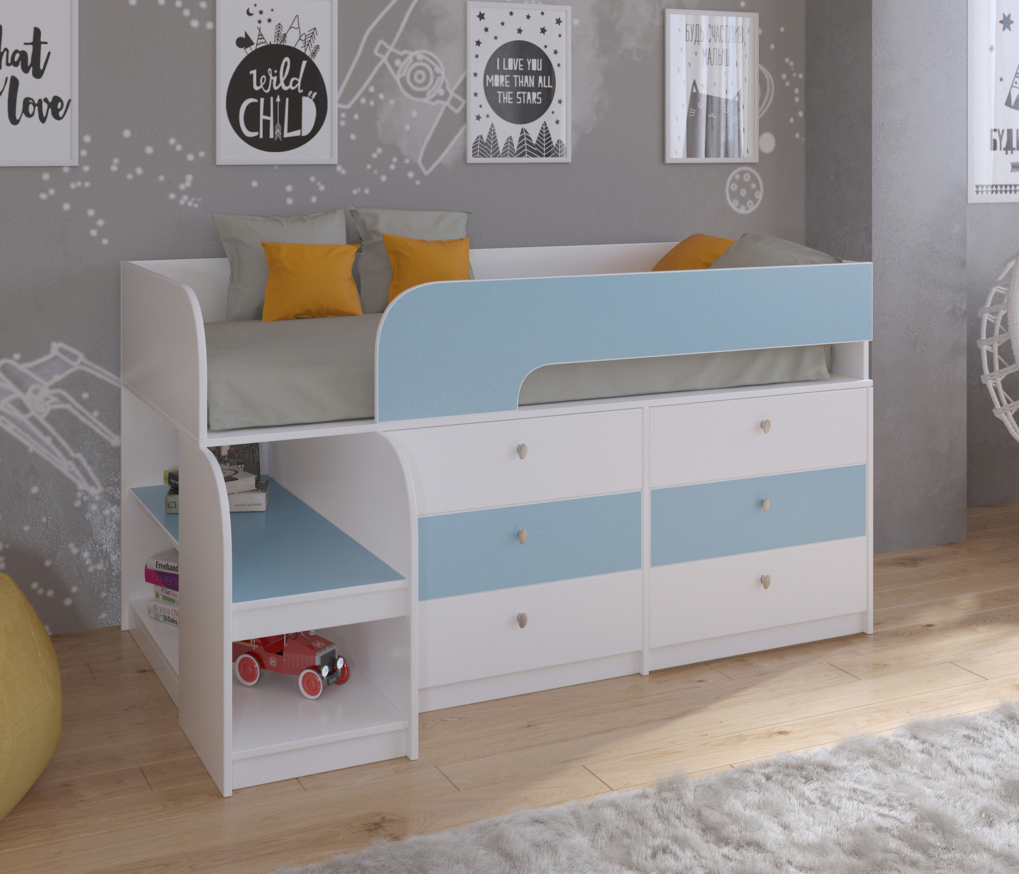 Кровать-чердак Астра 9 превосходно подойдет для детей раннего возраста. Компактная конструкция кровати позволяет сэкономить место в комнате и в то же время хранить массу необходимых вещей. Шесть вместительных ящиков отлично подойдут для хранения детских принадлежностей, одежды или книг. На двух больших полках, переходящих в лестницу, ребенок может ""выставлять напоказ"" свои игрушки или творческие поделки.