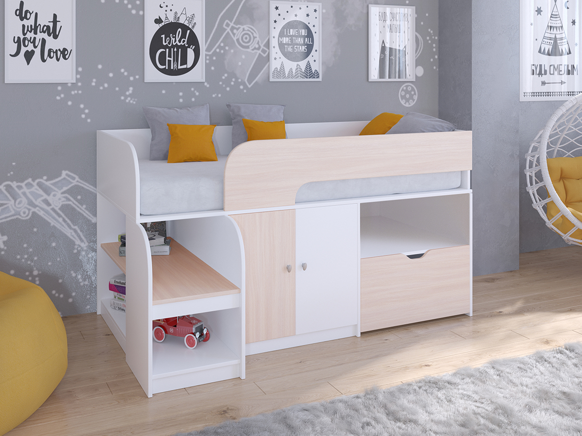 Кровать-чердак Астра 9 превосходно подойдет для детей раннего возраста. Компактная конструкция кровати позволяет сэкономить место в комнате и в то же время хранить массу необходимых вещей. Вместительный шкафчик позволит разместить в своих недрах детскую одежду. На просторной полке можно разместить массу книг. А большой, глубокий ящик позволит хранить огромное количество детских игрушек. На двух больших полках, переходящих в лестницу, ребенок может ""выставлять напоказ"" свои игрушки или творческие поделки.