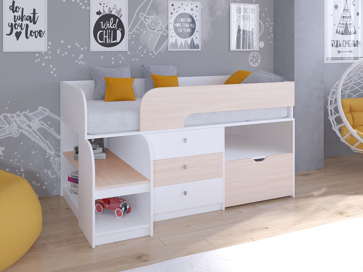 Кровать-чердак Астра 9 превосходно подойдет для детей раннего возраста. Компактная конструкция кровати позволяет сэкономить место в комнате и в то же время хранить массу необходимых вещей.  Три вместительных ящика подходят для хранения детских принадлежностей, одежды или книг. На просторной полке можно разместить массу книг.  А большой, глубокий ящик позволит хранить огромное количество детских игрушек. На двух больших полках, переходящих в лестницу, ребенок может ""выставлять напоказ"" свои игрушки или творческие поделки.