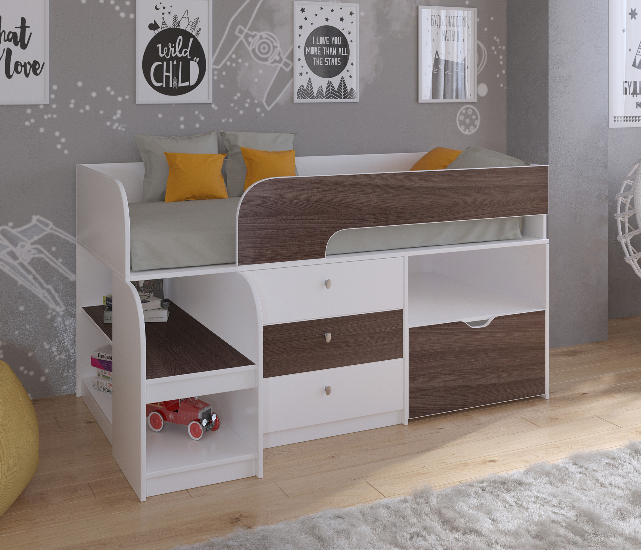 Кровать-чердак Астра 9 превосходно подойдет для детей раннего возраста. Компактная конструкция кровати позволяет сэкономить место в комнате и в то же время хранить массу необходимых вещей.  Три вместительных ящика подходят для хранения детских принадлежностей, одежды или книг. На просторной полке можно разместить массу книг.  А большой, глубокий ящик позволит хранить огромное количество детских игрушек. На двух больших полках, переходящих в лестницу, ребенок может ""выставлять напоказ"" свои игрушки или творческие поделки.