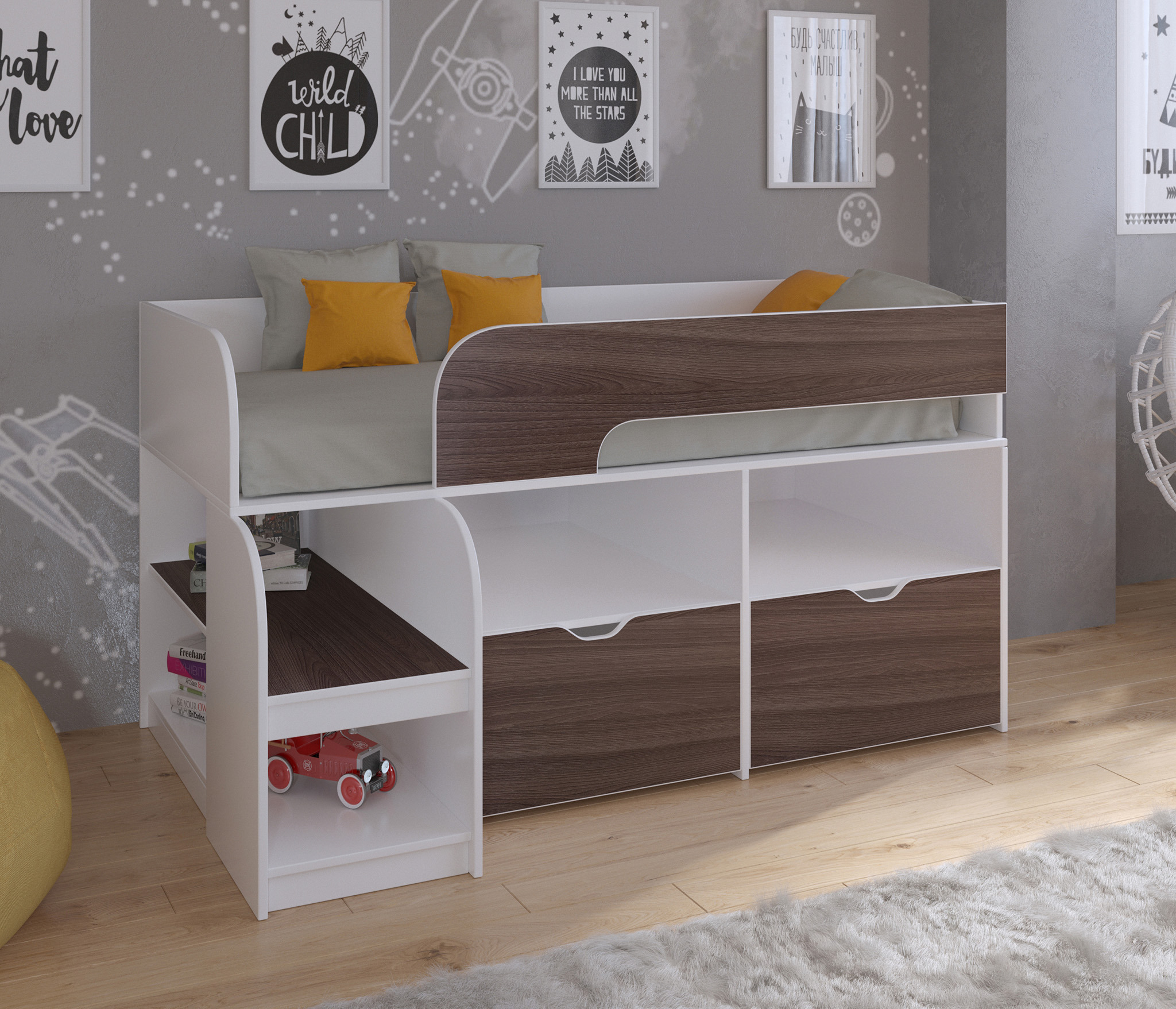Кровать-чердак Астра 9 превосходно подойдет для детей раннего возраста. Компактная конструкция кровати позволяет сэкономить место в комнате и в то же время хранить массу необходимых вещей. На двух просторных полках можно разместить массу книг и детских принадлежностей. А два больших, глубоких ящика позволят хранить огромное количество детских игрушек. На двух больших полках, переходящих в лестницу, ребенок может ""выставлять напоказ"" свои игрушки или творческие поделки.