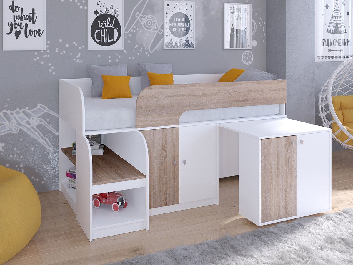 Кровать-чердак Астра 9 превосходно подойдет для детей раннего возраста. Компактная конструкция кровати позволяет сэкономить место в комнате и в то же время хранить массу необходимых вещей. Вместительный шкафчик позволит разместить в своих недрах детскую одежду. А выкатной стол позволит ребенку заниматься разнообразным творчеством. Удобный шкафчик с полочкой, расположенный в ножке стола, позволит аккуратно хранить многочисленные карандаши, фломастеры, краски и другие инструменты для творчества.